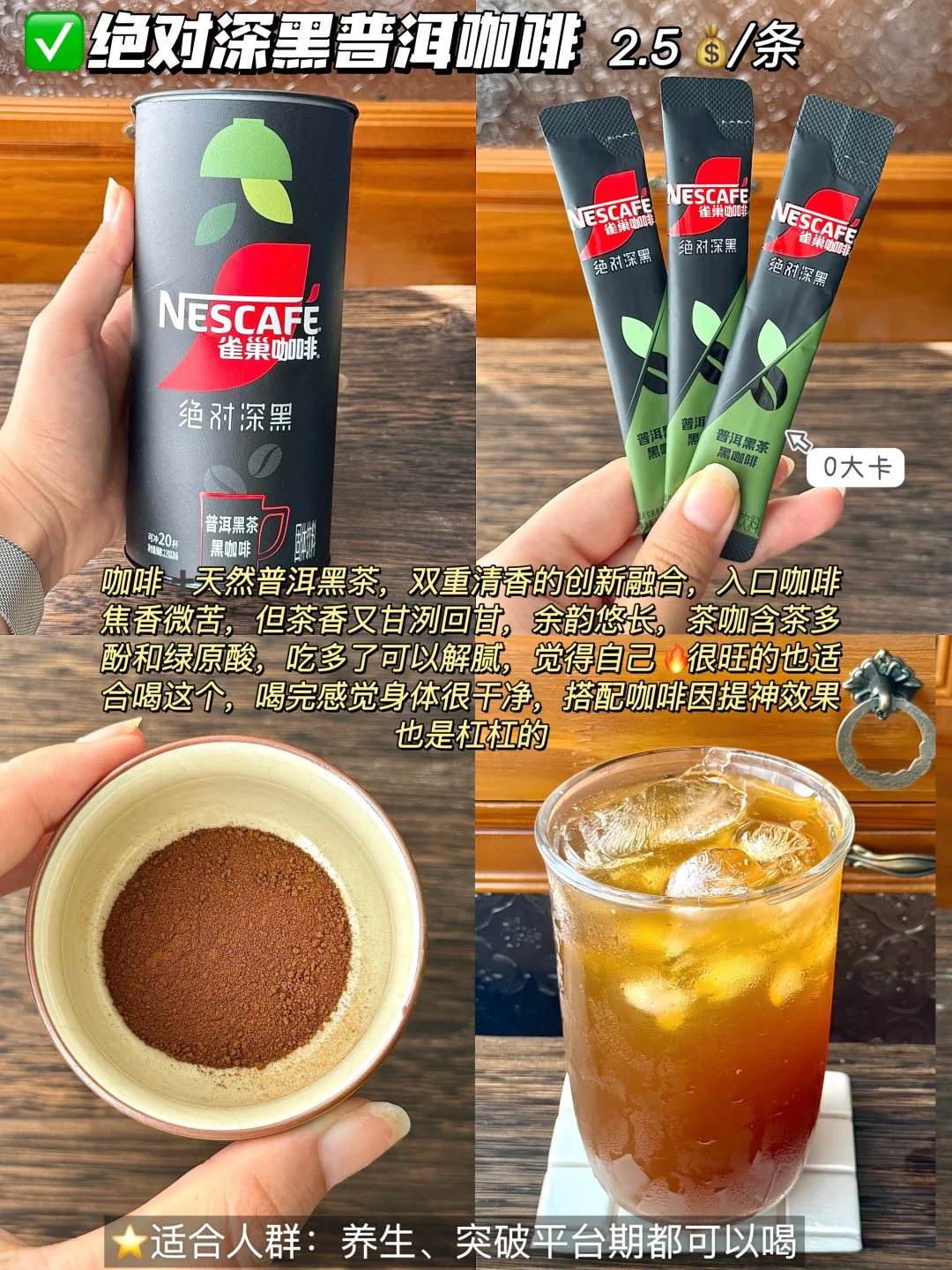 ⭐️口味:咖啡➕天然普洱黑茶,双重清香的创新融合,入口咖啡焦香微苦,但茶香又甘洌回甘,余韵悠长,