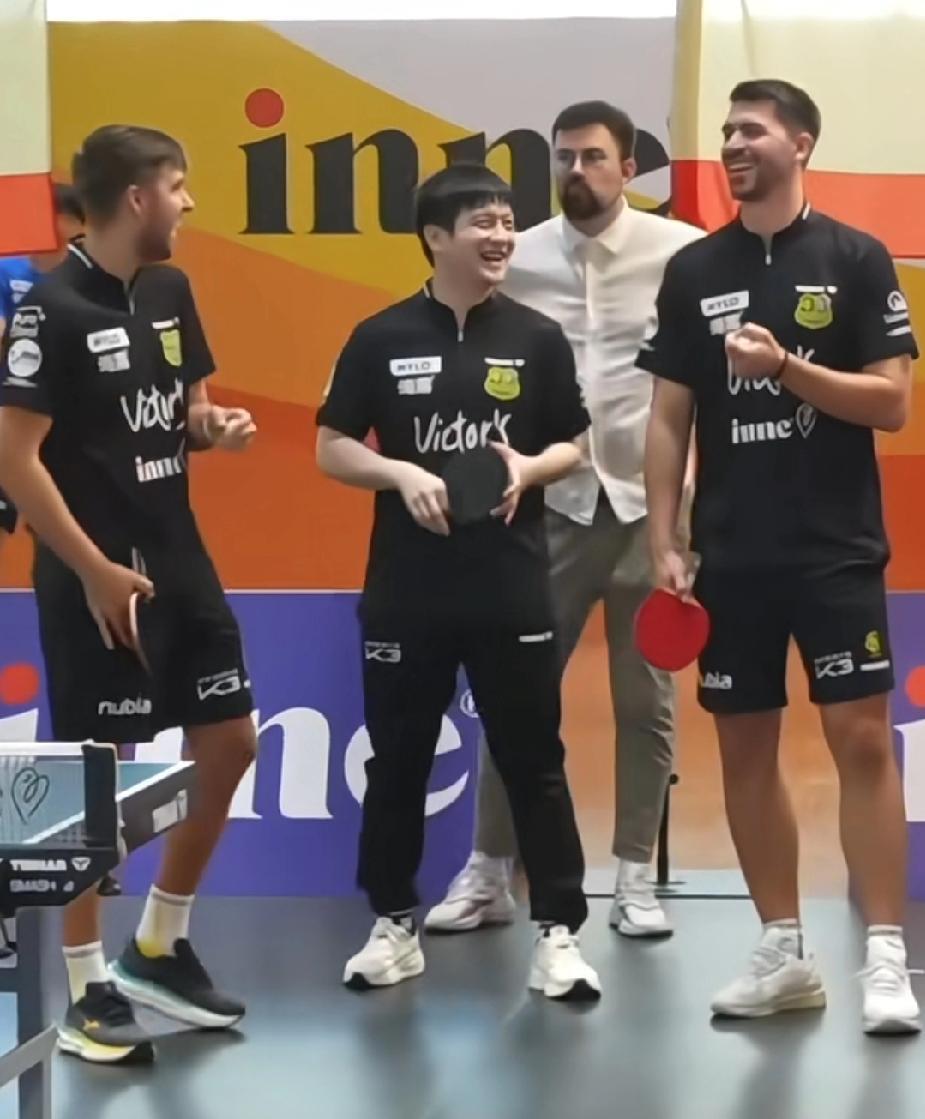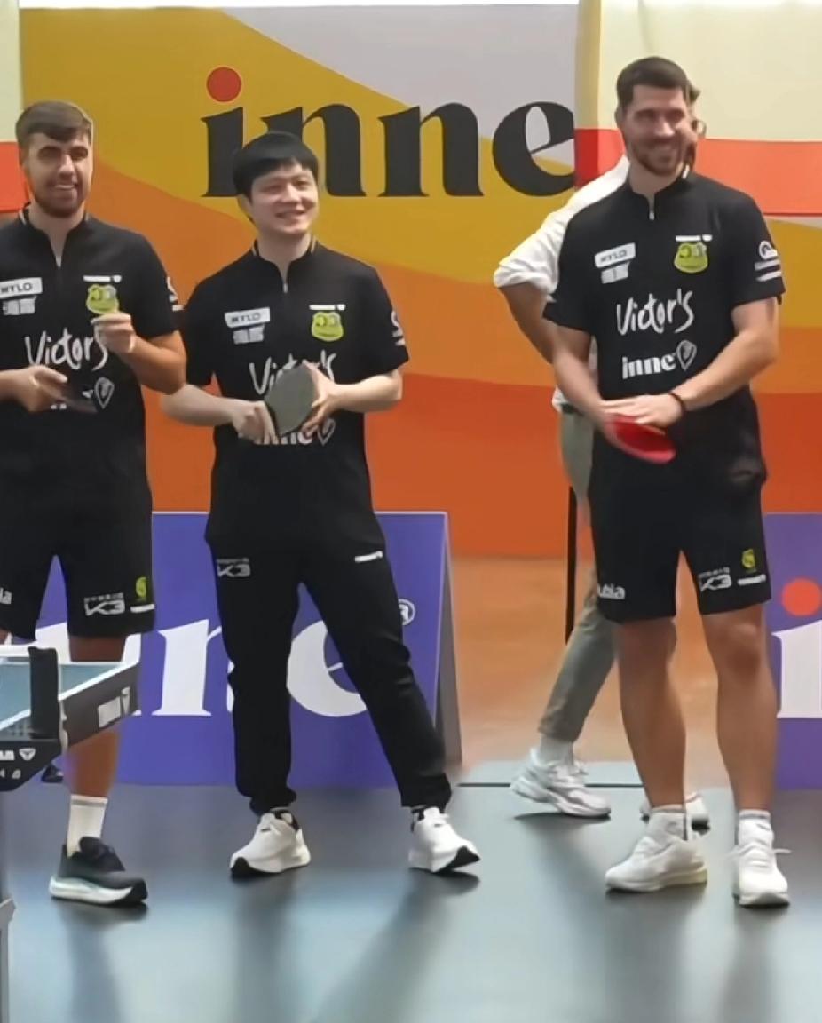 在德甲乒乓球赛场的樊振东,一身紧身队服尽显活力,和队友们谈笑间满是融洽。赛场上的