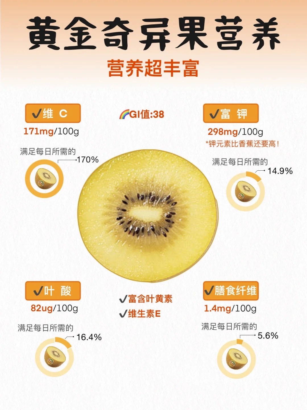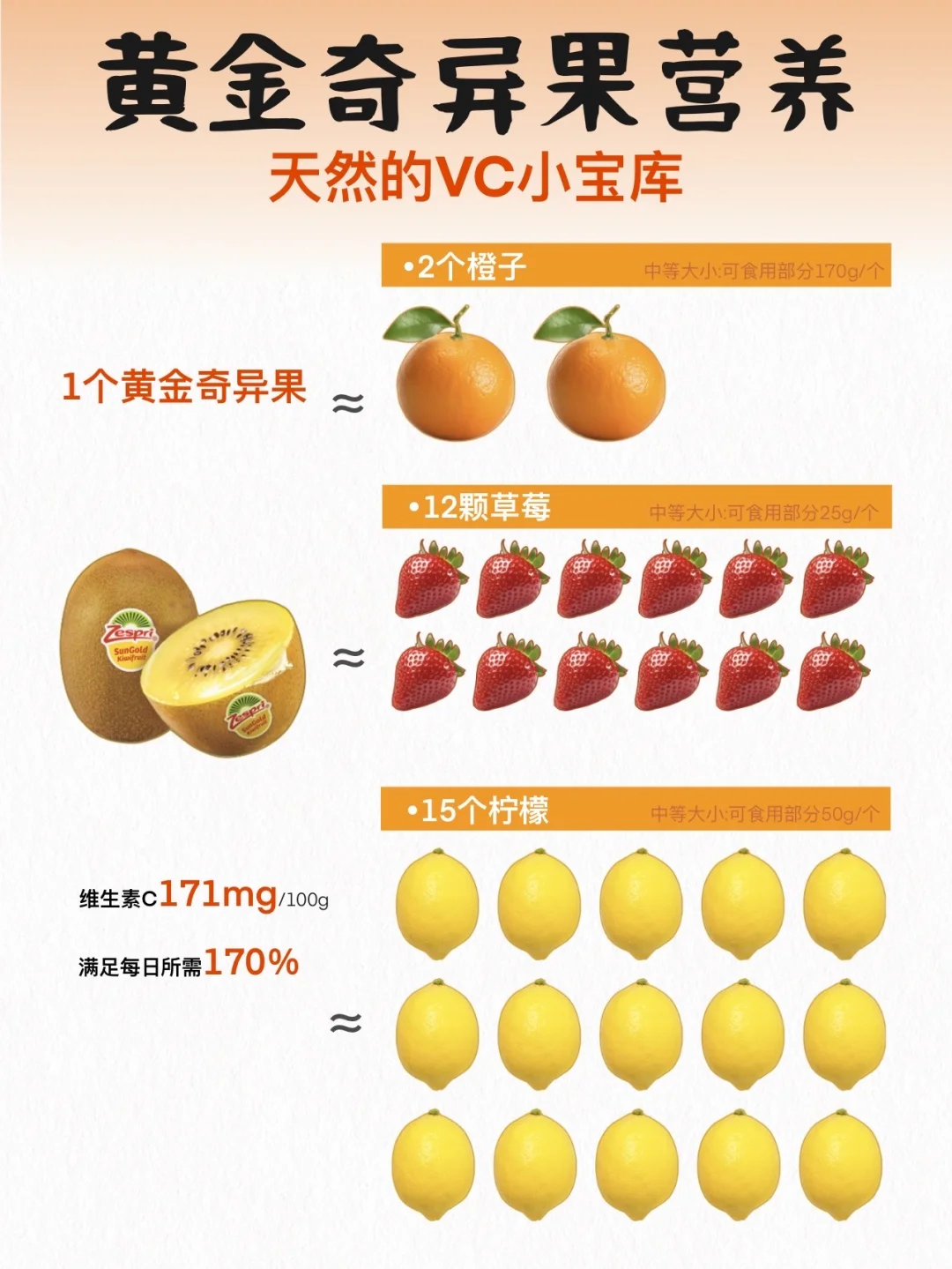 1颗黄心奇异果的VC含量 ≈2颗橙子 / 12颗草莓 / 15颗柠檬 / 86颗苹果!