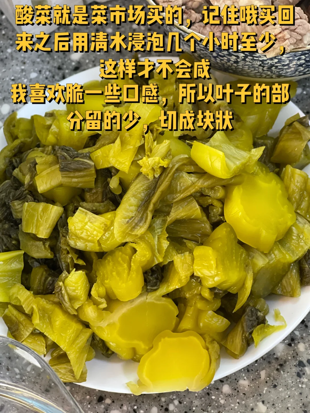 4. 酸菜就是菜市场买的,记住哦买回来之后用清水浸泡几个小时至少,这样才不会咸,我喜欢脆一些口感,所以叶子的部分留的少,切成块状