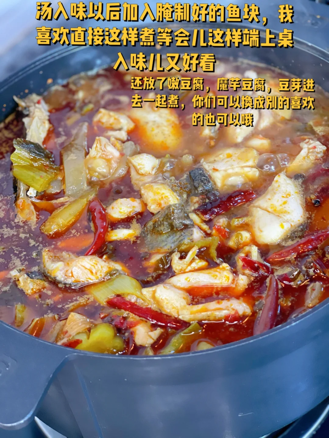 8. 汤入味以后加入腌制好的鱼块,我喜欢直接这样煮等会儿这样端上桌入味儿又好看