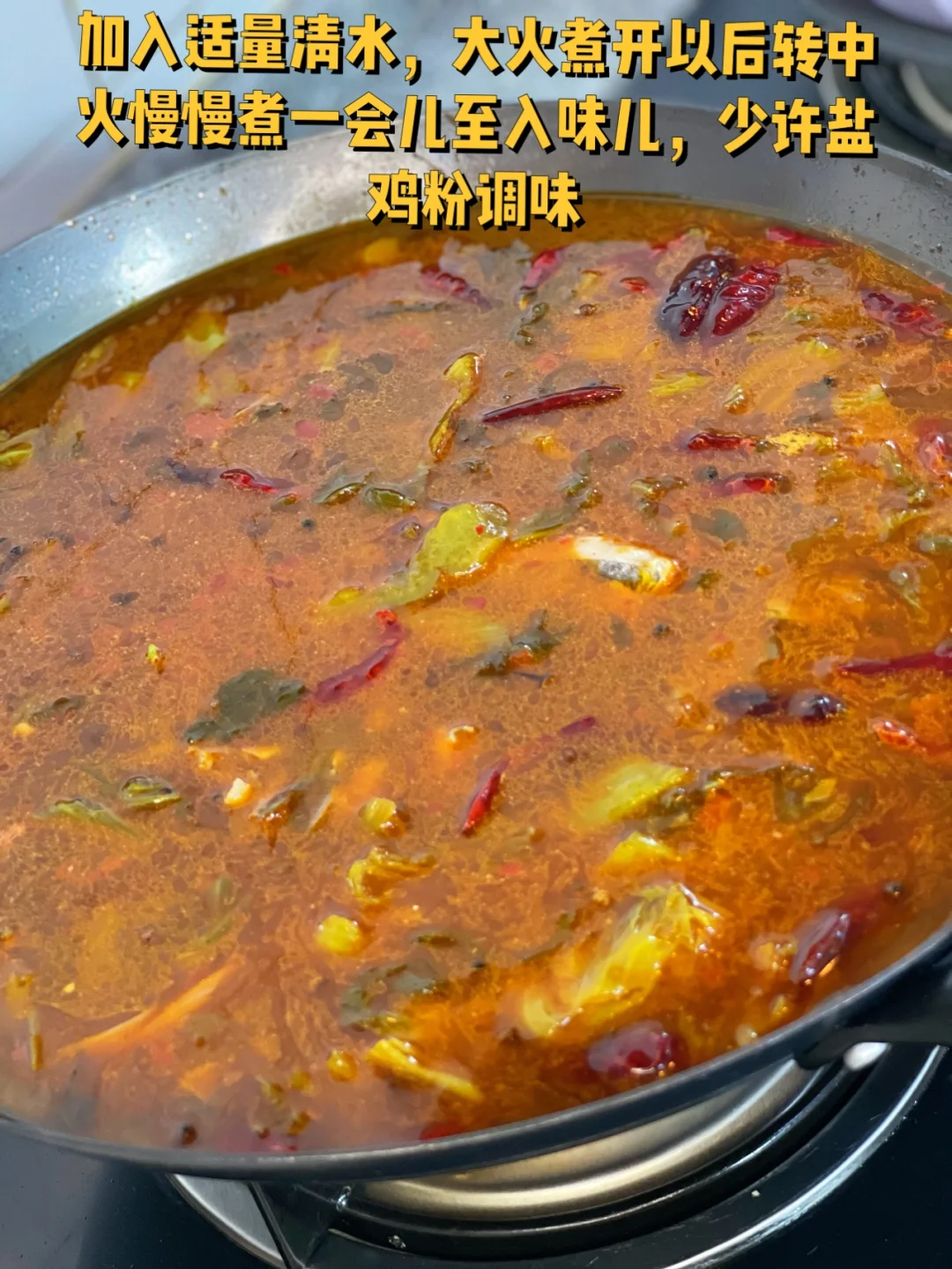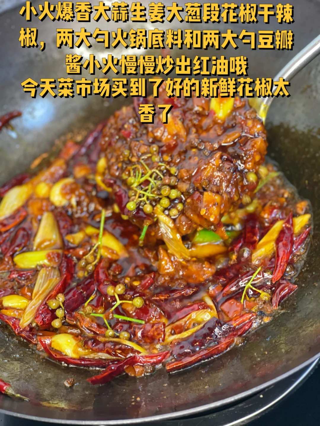5. 小火爆香大蒜生姜大葱段花椒干辣椒,两大勺火锅底料和两大勺豆瓣酱小火慢慢炒出红油哦,今天菜市场买到了好的新鲜花椒太香了