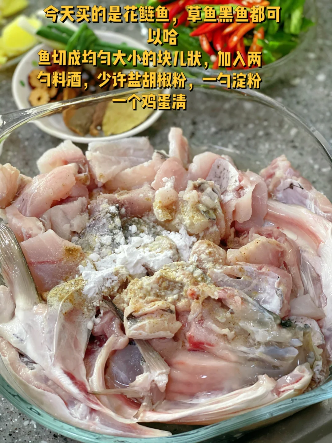 2. 鱼切成均匀大小的块儿状,加入两勺料酒,少许盐胡椒粉,一勺淀粉一个鸡蛋清