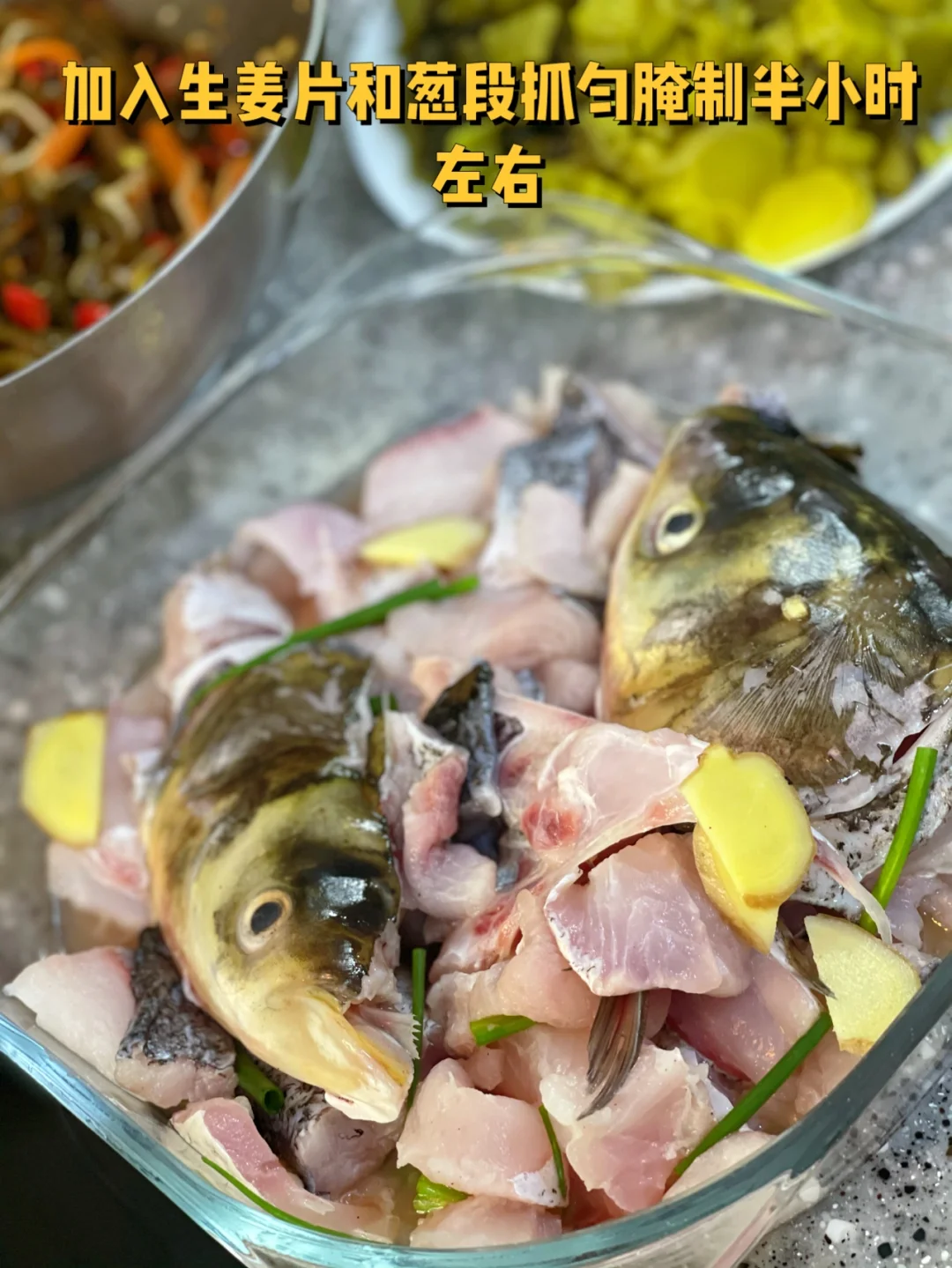 3. 加入生姜片和葱段抓匀腌制半小时左右