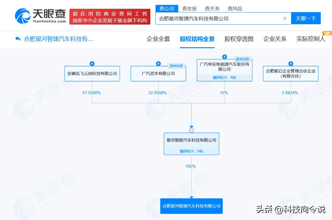 【科大讯飞与广汽合资公司在合肥成立新公司 注册资本2000万】 天眼查工商信息显示,近日,合肥星河智捷汽车科技有限公司成立,法定代表人为刘俊峰,注册资本2000万人民币,经营范围含网络技术服务、信息系统集成服务、人工智能基础软件开发、人工智能行业应用系统集成服务、人工智能应用软件开发、互联网数据服务、信息技术咨询服务、信息系统运行维护服务、数据处理和存储支持服务、集成电路芯片及产品销售等。股权全景穿透图显示,该公司由星河智联汽车科技有限公司全资持股,后者由科大讯飞旗下安徽讯飞云创科技有限公司、广汽集团旗下广汽资本有限公司、广汽埃安新能源汽车股份有限公司等共同持股。 天眼查信息: