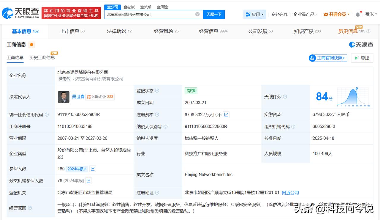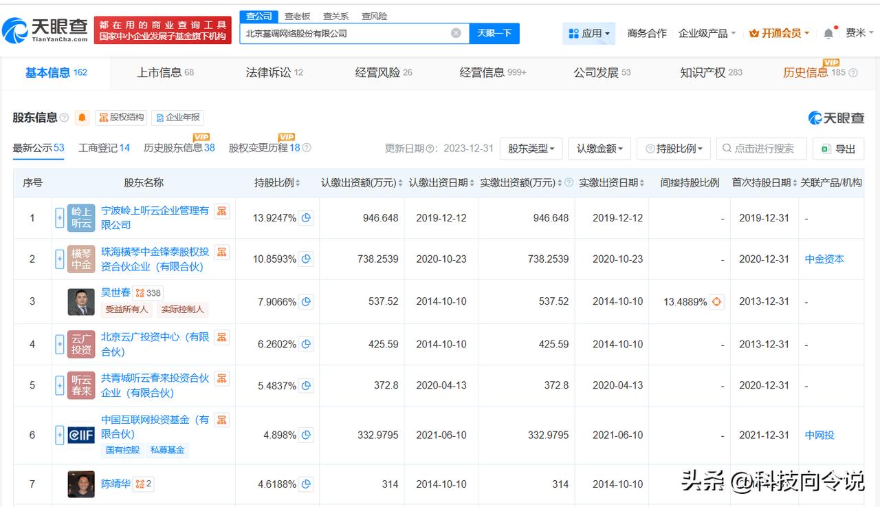 【吴世春被冻结537万股权 吴世春所持537万股权被冻结】 天眼查天眼风险信息显示,近日,北京基调网络股份有限公司新增一则股权冻结信息,被执行人为吴世春,股权所在企业为该公司,冻结股权数额537万余元人民币,冻结期限为3年,执行法院为北京市第三中级人民法院。 北京基调网络股份有限公司成立于2007年3月,法定代表人为吴世春,注册资本约6798万人民币,经营范围包括计算机系统服务、软件销售、软件开发等。股东信息显示,该公司由宁波岭上听云企业管理有限公司、珠海横琴中金锋泰股权投资合伙企业(有限合伙)、吴世春等共同持股。 天眼查信息: