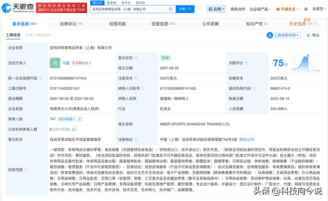 【始祖鸟关联公司曾抽检不合格 始祖鸟关联方曾参与起草环保相关标准】始祖鸟回应道歉信版本不一样 据媒体报道,9月20日,户外品牌始祖鸟联手以火药爆破作品成名的艺术家蔡国强,在喜马拉雅山放烟花的事件,引发争议。9月21日,始祖鸟被曝在海外社交媒体平台发表的英文说明内容与国内版本有差异。 天眼查工商信息显示,始祖鸟关联公司亚玛芬体育用品贸易(上海)有限公司成立于2007年9月,法定代表人为马磊,注册资本250万美元,经营范围包括体育用品及器材零售、食品销售、软件开发等。股东信息显示,该公司由亚玛芬体育香港有限公司全资持股。 抽查检查信息显示,该公司曾在2017年4月被上海市卫生和计划生育委员会监督所抽查,结果为不合格。此外,标准信息显示,该公司于2022年参与起草“鞋类 再生材料利用指南”团体标准文件,目前标准状态为现行。 天眼查信息: