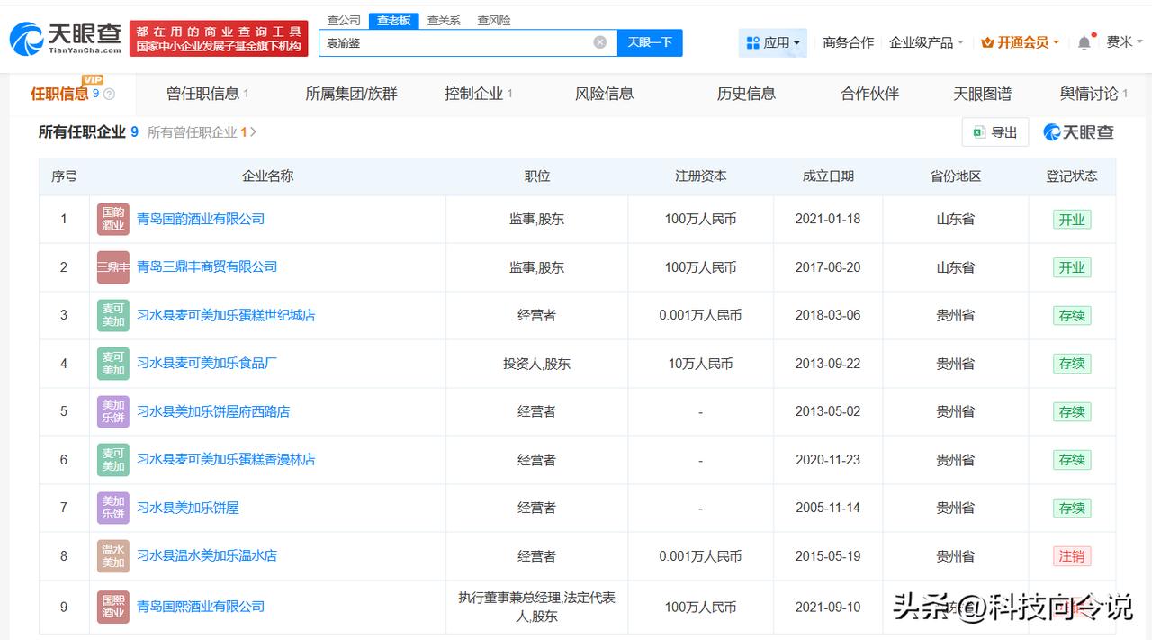 【揭秘致136人感染住院涉事公司 致136人感染住院涉事公司出资额仅10万】贵州遵义成立工作组 据媒体报道,近日,记者从贵州省遵义市食品药品安全委员会办公室了解到,日前发生的食物沙门氏菌感染截至21日17时已造成136人出现不适症状。经排查,患者反映食用的“三明治”糕点为习水县麦可美加乐食品厂生产。 天眼查工商信息显示,习水县麦可美加乐食品厂成立于2013年9月,为袁渝鉴个人独资企业,出资额10万人民币,经营范围为糕点、月饼加工、销售。 值得一提的是,袁渝鉴名下关联9家企业,其中7家企业处于存续状态,包括习水县麦可美加乐蛋糕世纪城店、习水县美加乐饼屋府西路店、习水县麦可美加乐蛋糕香漫林店等。 天眼查信息: -c1604820232