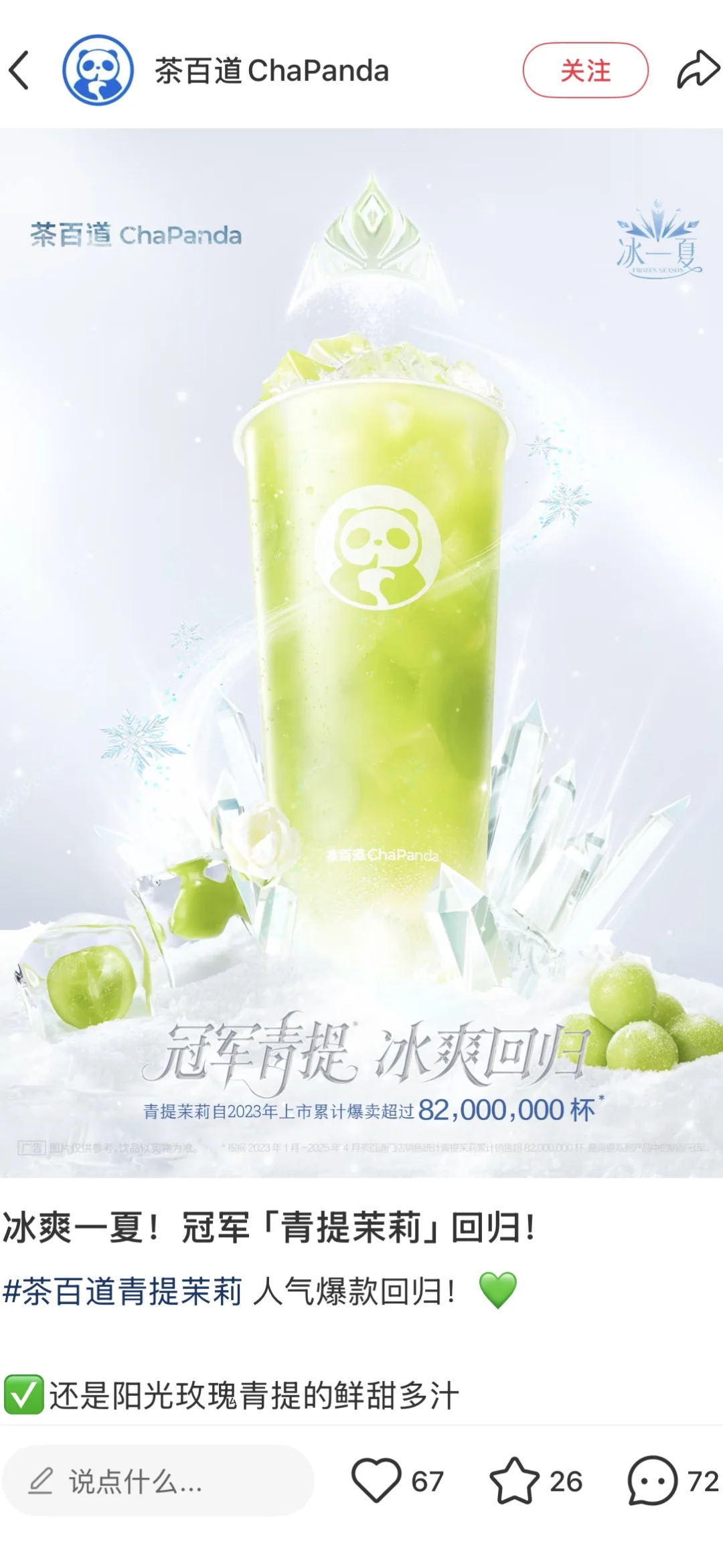 茶百道夏日zui清爽的青提茉莉终于回归了。。。