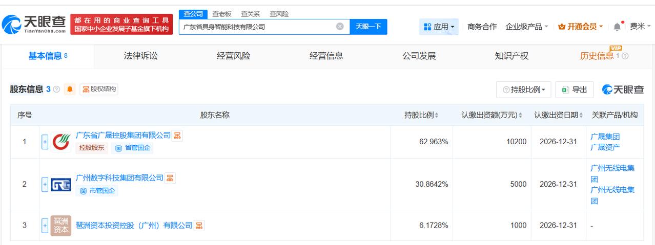 广东省具身智能科技公司登记成立注册资本1.62亿 天眼查App显示,近日,广东省具身智能科技有限公司成立,法定代表人为高芳,注册资本1.62亿人民币,经营范围包括人工智能应用软件开发、人工智能基础软件开发、人工智能理论与算法软件开发等。股东信息显示,该公司由广东省广晟控股集团有限公司、广州数字科技集团有限公司、琶洲资本投资控股(广州)有限公司共同持股。 天眼查信息: