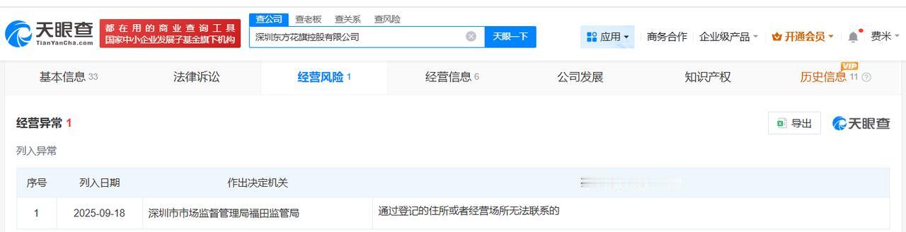 花旗金控旗下深圳公司经营异常 天眼查经营风险信息显示,近日,深圳东方花旗控股有限