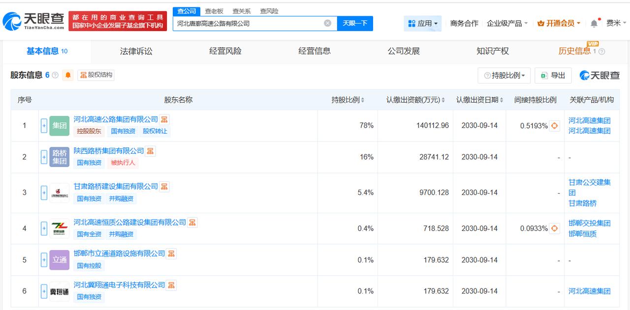 河北唐廊高速公路公司登记成立注册资本约17.96亿 天眼查App显示,近日,河北唐廊高速公路有限公司成立,法定代表人为智韶宇,注册资本约17.96亿人民币,经营范围包括工程管理服务、税务服务、企业总部管理等。股东信息显示,该公司由河北高速公路集团有限公司、陕西路桥集团有限公司、甘肃路桥建设集团有限公司等共同持股。 天眼查信息: