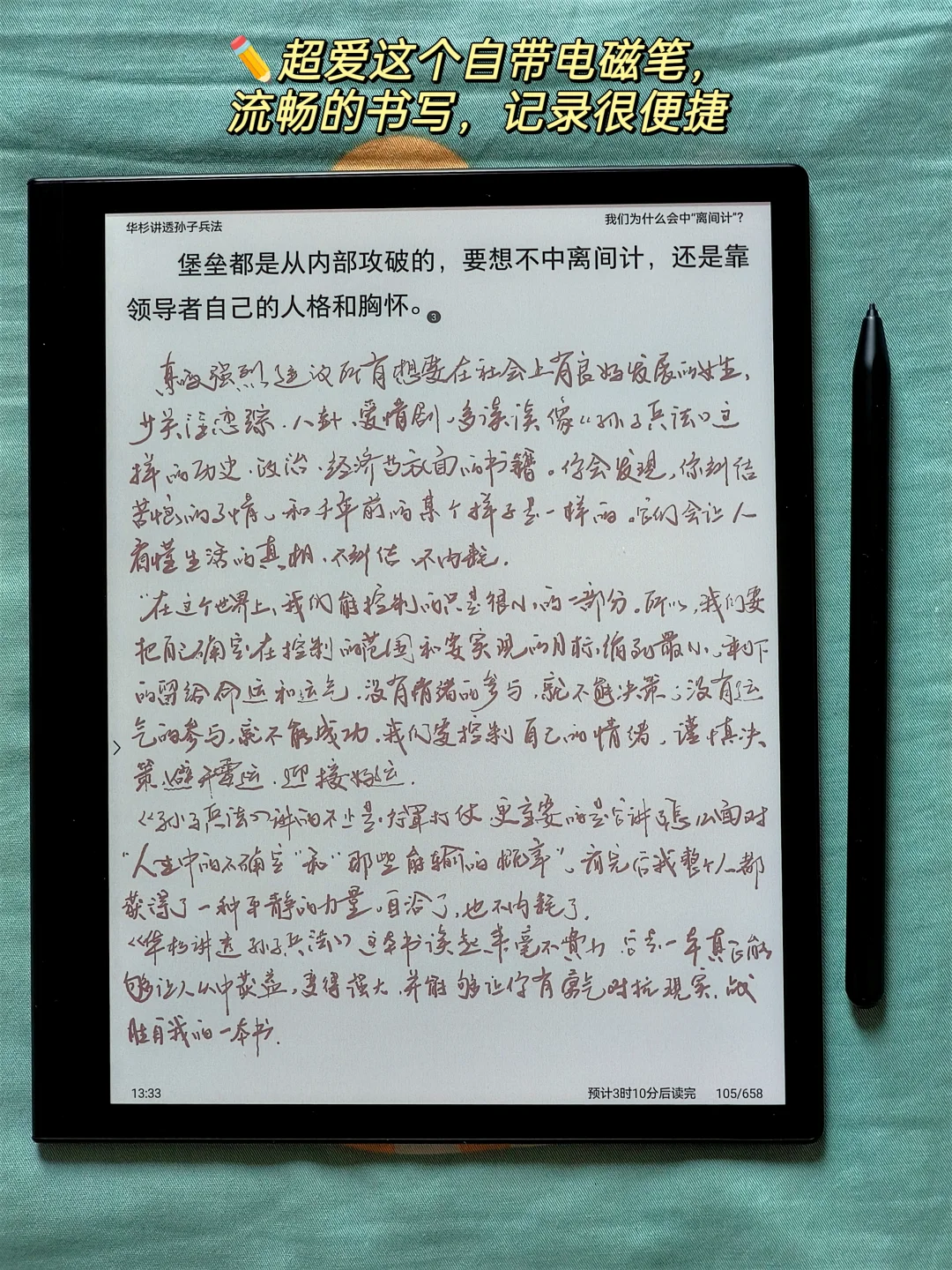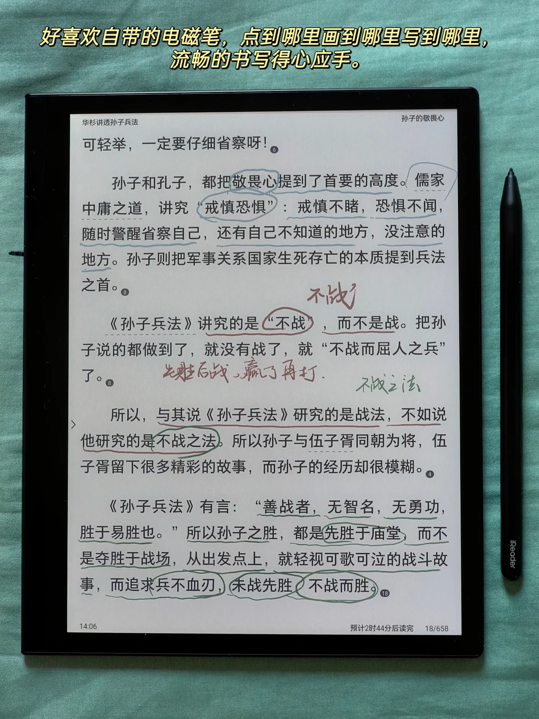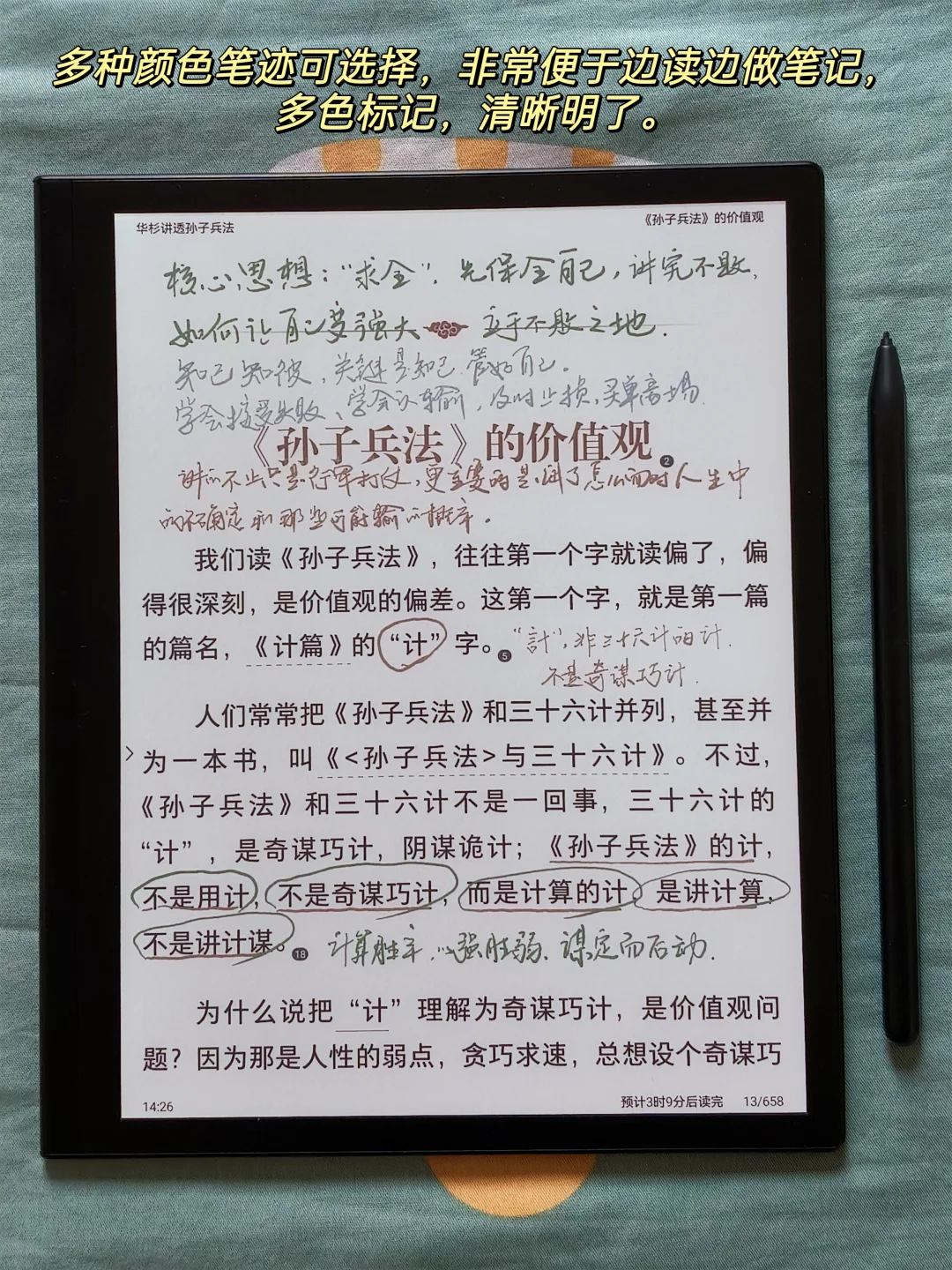 好喜欢自带的电磁笔,是不需要充电的,点到哪里画到哪里写到哪里,流畅的书写得心应手。还有多种颜色笔迹可选择,非常便于边读边做笔记,多色标记,清晰明了。很适合我这种喜欢写写画画的读书人。