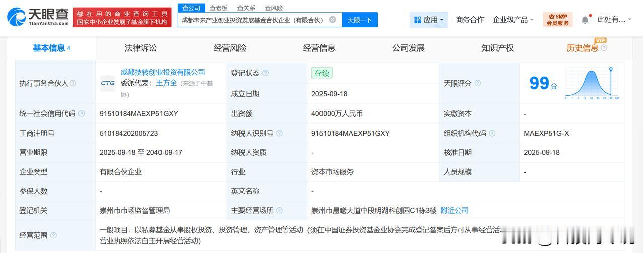 【成都未来产业创业投资发展基金成立 出资额40亿】 天眼查App显示,近日,成都未来产业创业投资发展基金合伙企业(有限合伙)成立,执行事务合伙人为成都技转创业投资有限公司,出资额40亿人民币,经营范围含以私募基金从事股权投资、投资管理、资产管理等活动。合伙人信息显示,该基金由成都产业投资集团有限公司、成都技转创业投资有限公司共同出资。 天眼查信息: