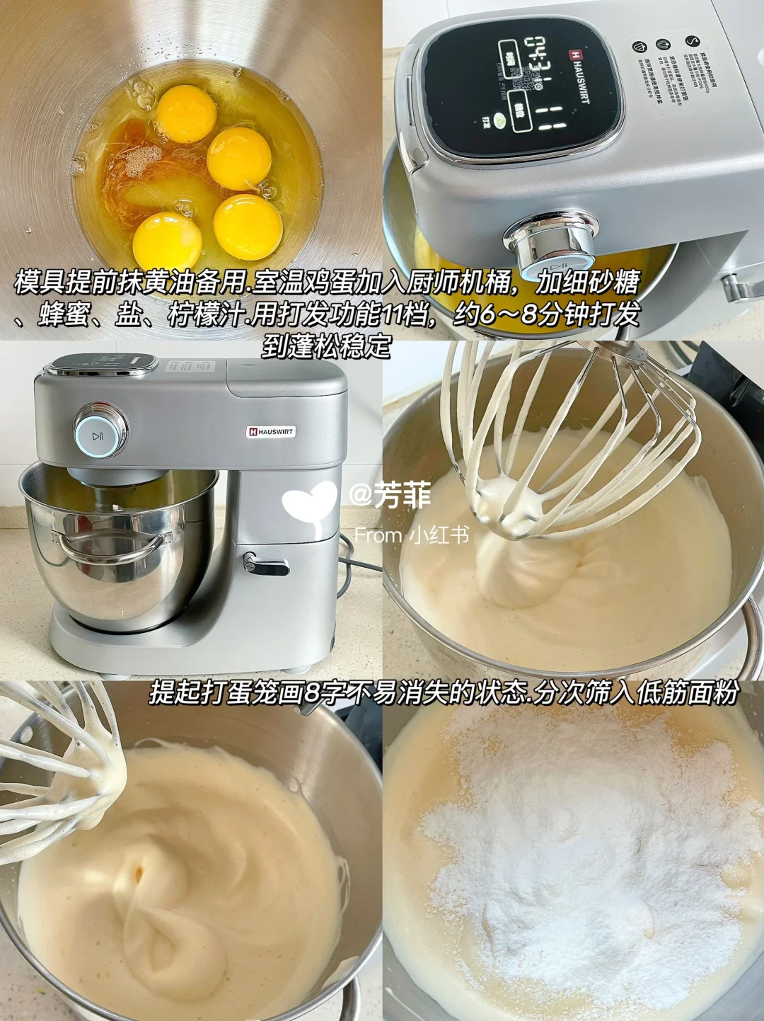 1️⃣准备好食材,模具提前刷黄油,鸡蛋用室温的.如果用打蛋器室温低,鸡蛋可以隔温热水暖一暖再用.这里用的室温鸡蛋直接放入海氏M5Max厨师机桶,加入细砂糖蜂蜜柠檬汁盐,用打发功能10~11档搅打6~8分钟,很快速高效就打到位了.打好的全蛋液蓬松稳定,画“8”字十秒不易消失的状态.⚠️这一步起关键性作用,一定要打到位
