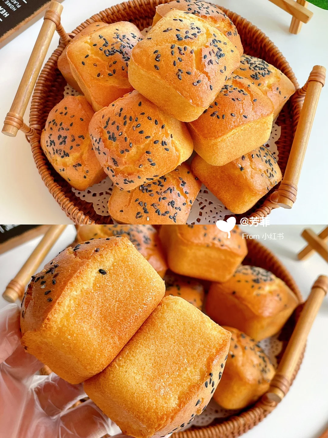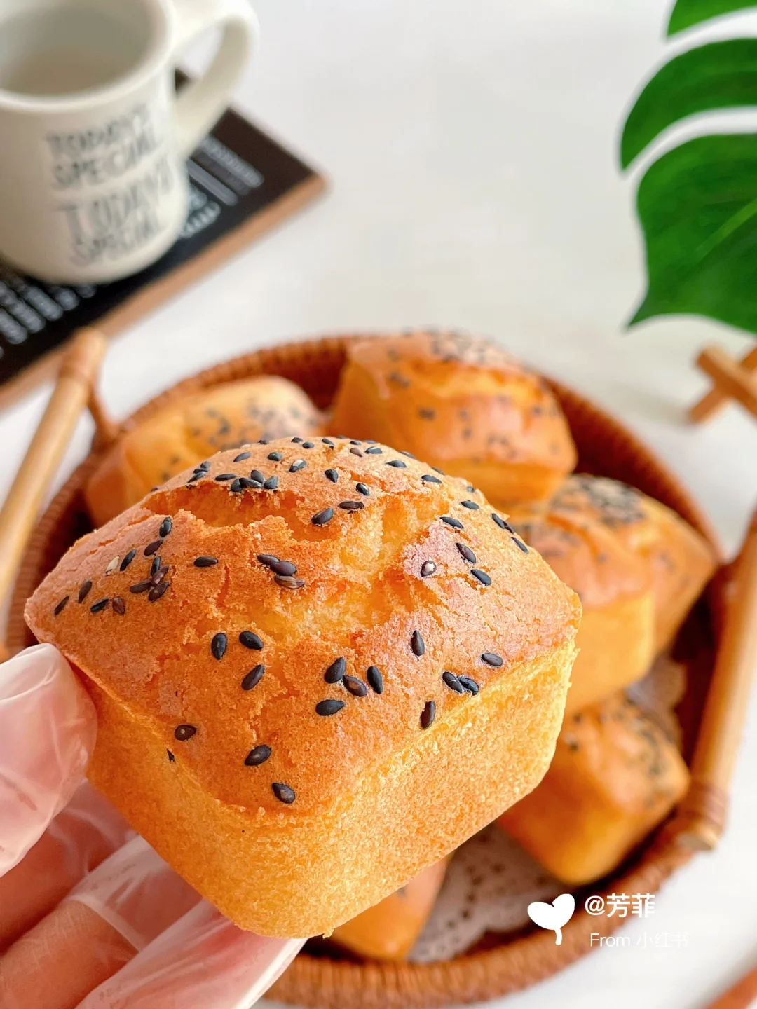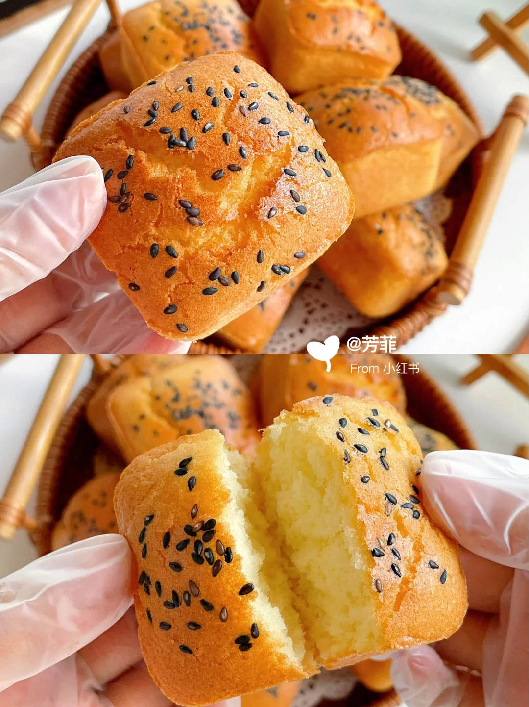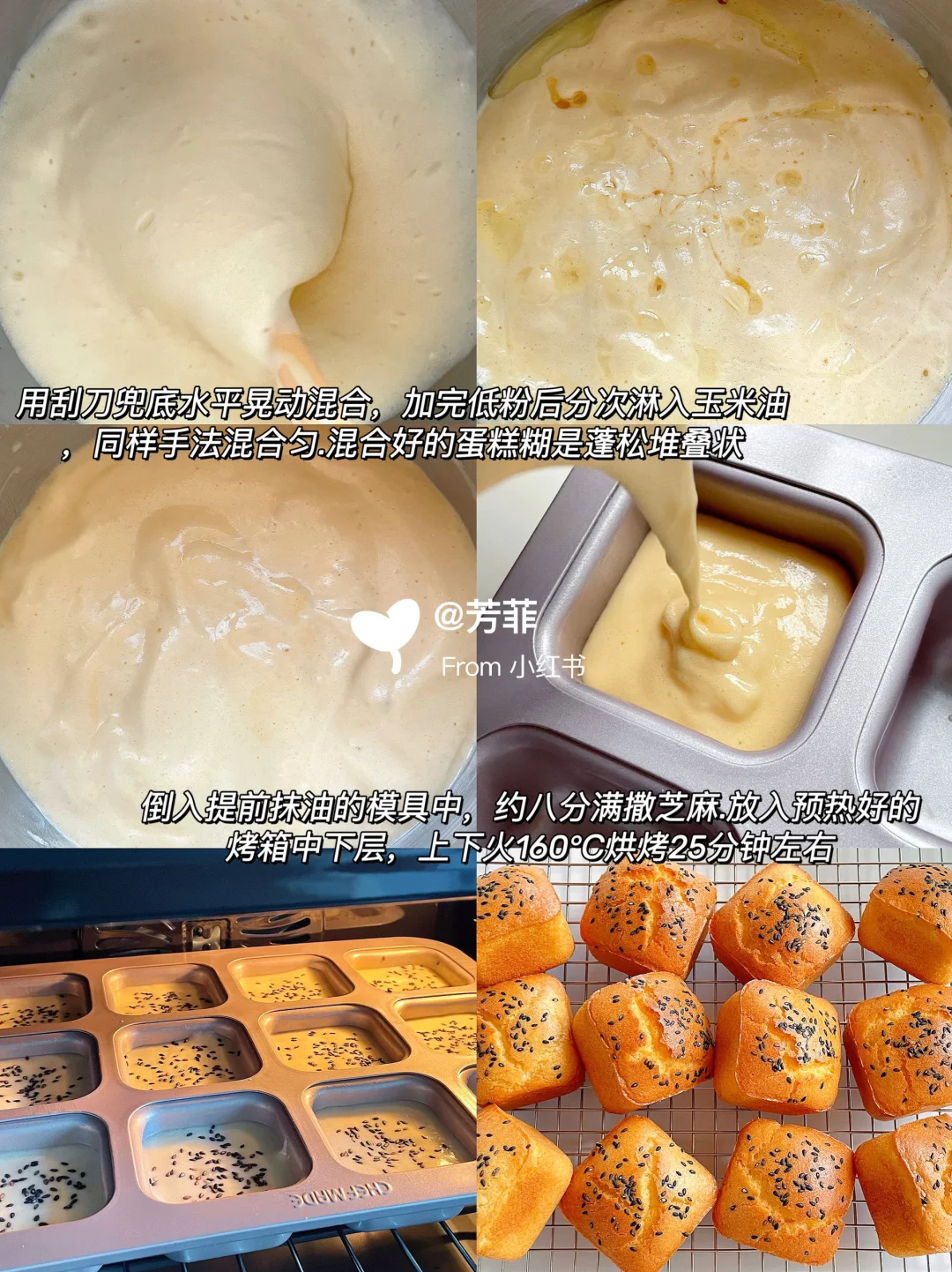 3️⃣蛋糕糊倒入刷油的模具中,约八分满撒芝麻.放入预热好的烤箱,160℃烘烤23~25分钟左右.表面上色金黄即可⚠️具体烘烤温度和时间需按自家烤箱温差灵活调节