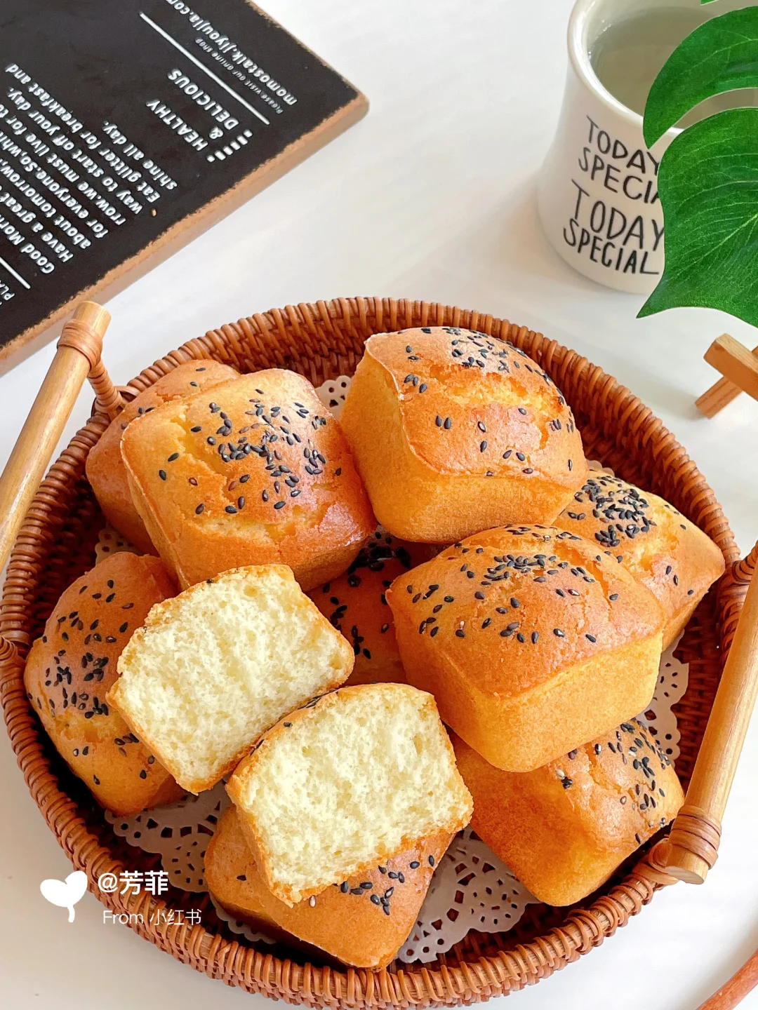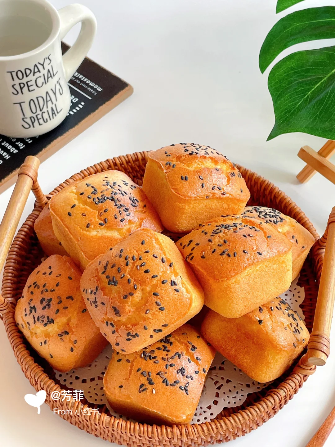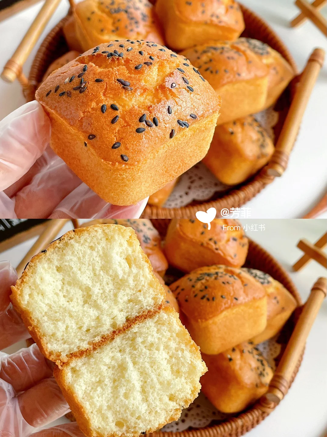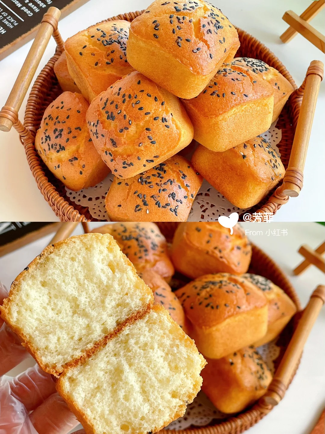 3️⃣蛋糕糊倒入刷油的模具中,约八分满撒芝麻.放入预热好的烤箱,160℃烘烤23~25分钟左右.表面上色金黄即可⚠️具体烘烤温度和时间需按自家烤箱温差灵活调节