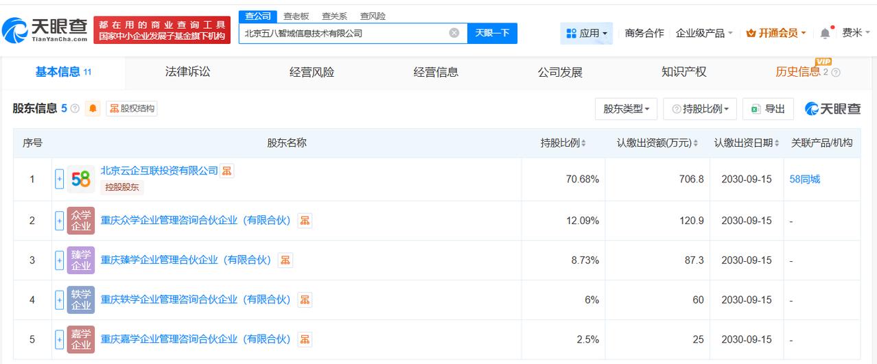 58同城等在北京成立信息技术新公司注册资本1000万 天眼查App显示,近日,北