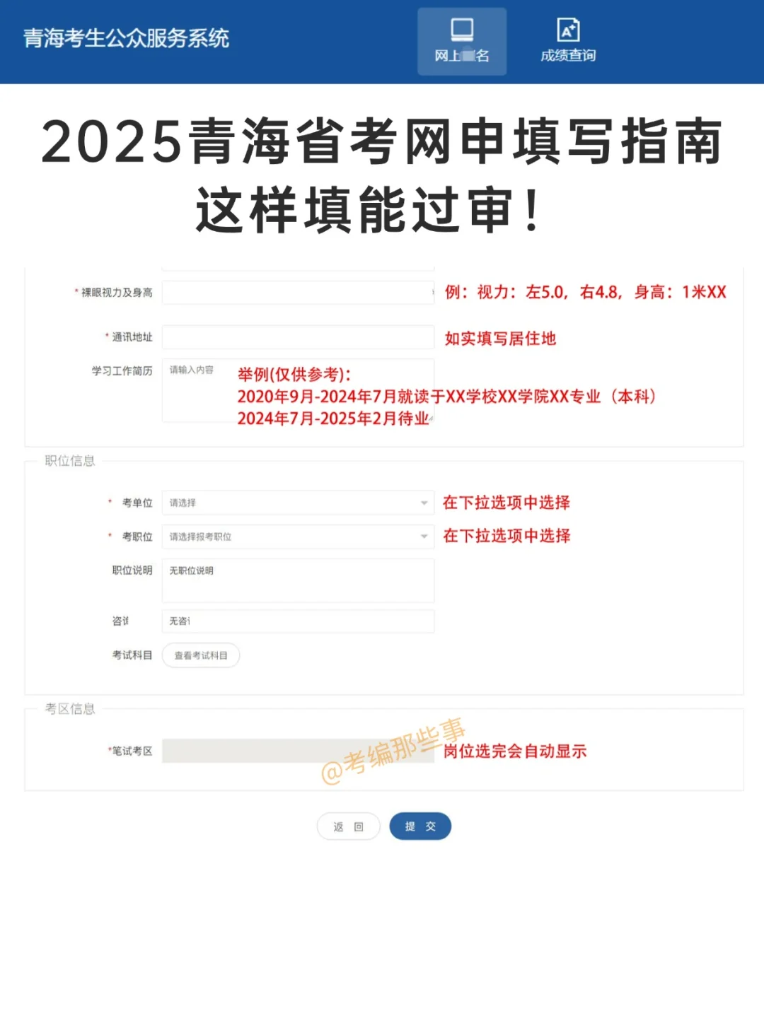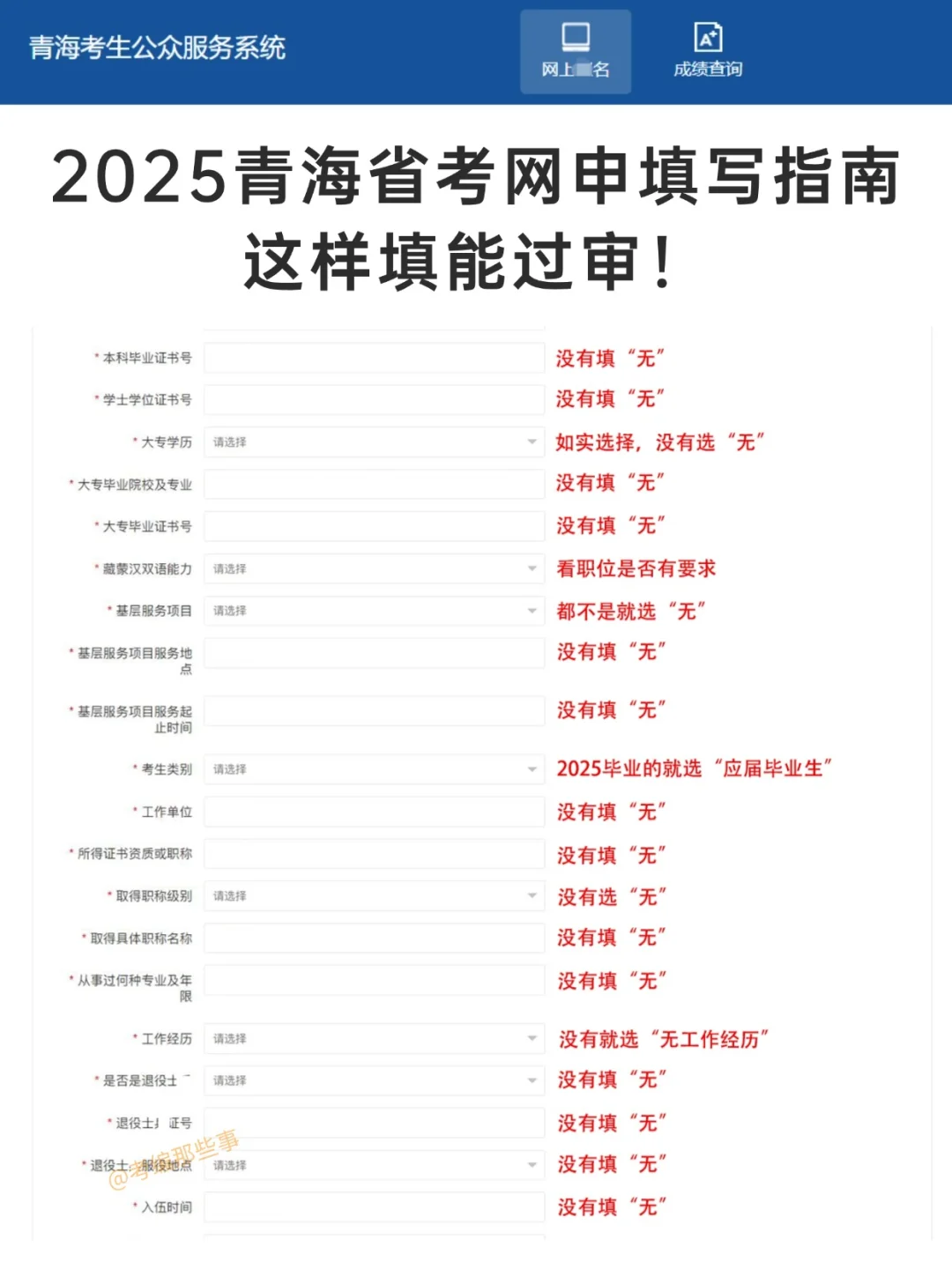 网申时间:2-17 9:00至02-21 18:00 资格审核:2-17 9:00至2-24 18:00 缴.费时间:2-17 9:00至2-24 23:30 网上调剂时间:2-25 9:00至2-25 16:00 加分现场审核时间:2-26至3-04 准考证打印时间:3-11 9时 至3-14 24时 笔试时间:3月15日 - 入大学前户籍所在地:如实选择,不是青海的就选省外 蕞高学历所学专业:专业名称,与毕业证书一致 蕞高学历毕业院校:学校全称,具体看毕业证书 蕞高学历毕业时间:如实填写 蕞高学历证书号:2025应届毕业生填无 蕞高学位:如实选择,无/学士/硕士/博士 蕞高学位证书号:2025应届毕业生填无 本科学历:如实选择 本科毕业院校及专业:如实填写本科学校和专业,没有填“无” 本科毕业证书号:没有填“无” 学士学位证书号:没有填“无” 大专学历:如实选择 大专毕业院校及专业:没有填“无” 大专毕业证书号:没有填“无” 藏蒙汉双语能力:看职位是否有要求 基层服务项目:都不是就选“无” 考生类别:2025毕业的就选“应届毕业生” 工作单位:没有填“无” 工作经历:没有就选“无工作经历” 视力及身高:视力:左5.0,右4.8,身高:1米XX 简历:举例(仅供参考): 2020年9月-2024年7月就读于XX学校XX学院XX专业(本科) 2024年7月-2025年2月待业 省考 考公 25省考 青海省考 省考备考 省考选岗 2025青海省考 公考 省考笔试