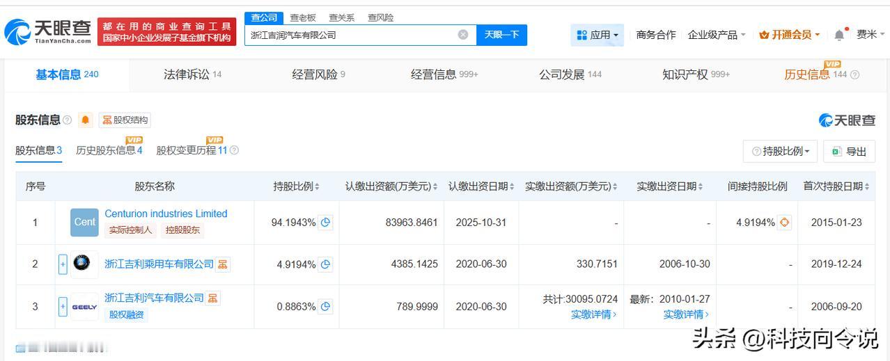 【吉润汽车增资至约8.91亿美元 增幅约13%】 天眼查App显示,近日,浙江吉润汽车有限公司发生工商变更,注册资本由7.9亿美元增至约8.91亿美元,增幅约13%。 浙江吉润汽车有限公司成立于2003年5月,法定代表人为淦家阅,经营范围包括汽车零部件及配件制造、汽车零配件批发、机动车修理和维护等。股东信息显示,该公司由Centurion industries Limited、浙江吉利乘用车有限公司、浙江吉利汽车有限公司共同持股。 天眼查信息: