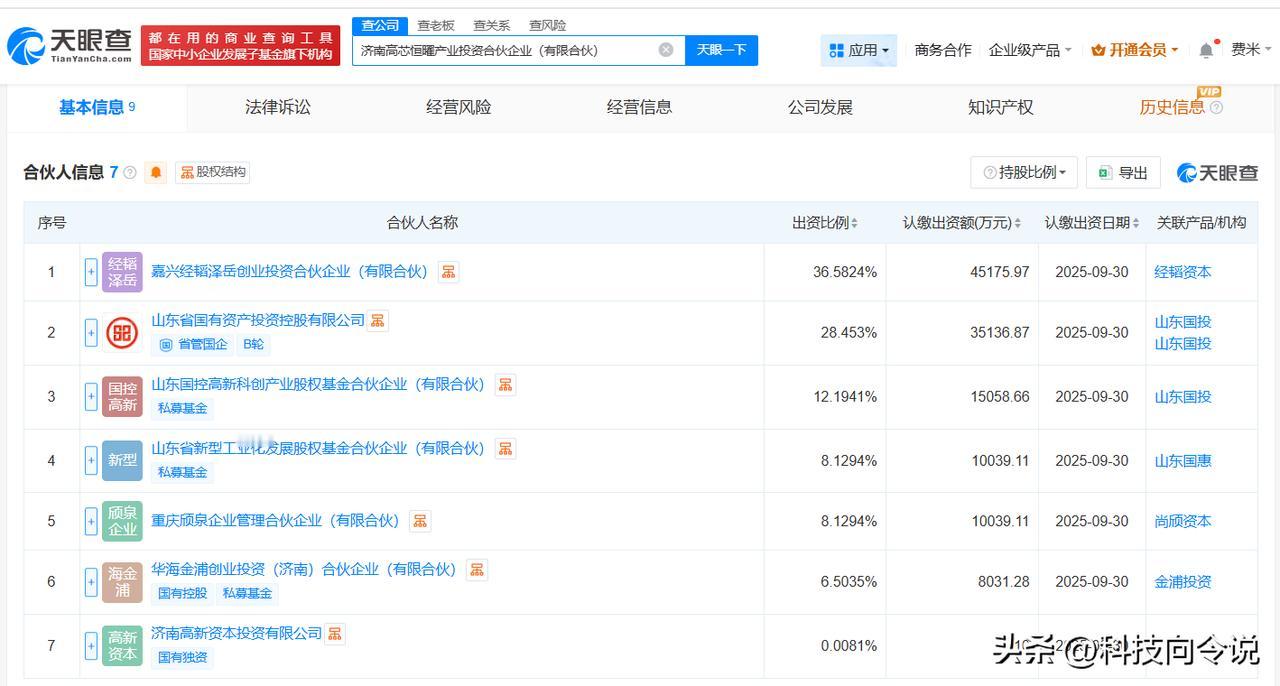 【济南高芯恒曜产业投资合伙企业登记成立 出资额约12.35亿】 天眼查App显示,近日,济南高芯恒曜产业投资合伙企业(有限合伙)成立,执行事务合伙人为济南高新资本投资有限公司,出资额约12.35亿人民币,经营范围为以自有资金从事投资活动。合伙人信息显示,该合伙企业由嘉兴经韬泽岳创业投资合伙企业(有限合伙)、山东省国有资产投资控股有限公司、山东国控高新科创产业股权基金合伙企业(有限合伙)等共同出资。 天眼查信息:
