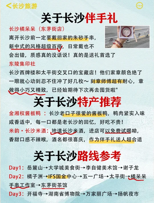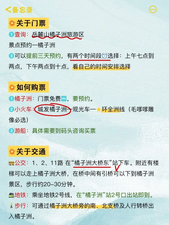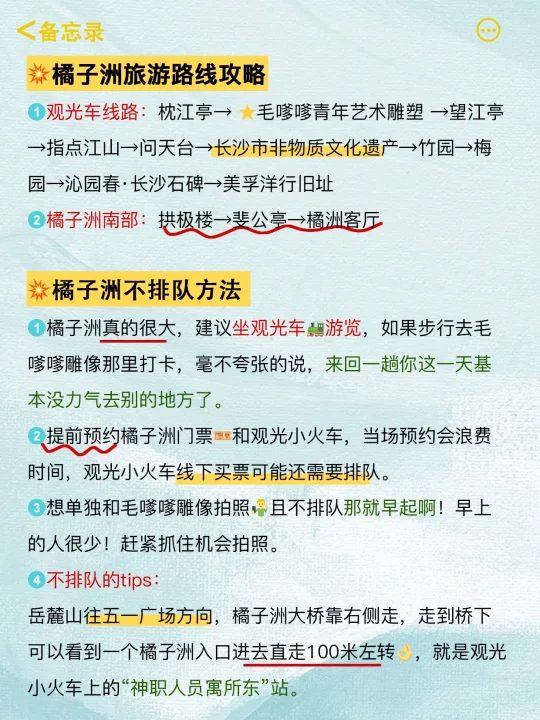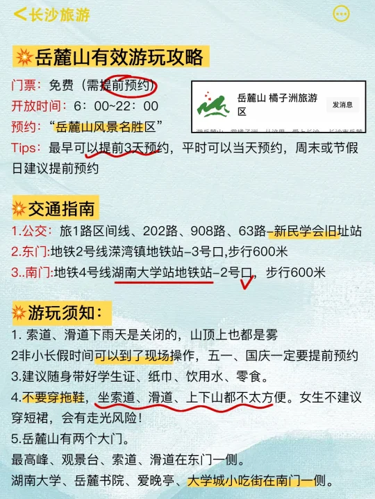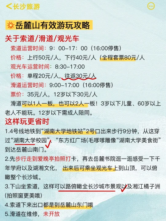 - 橘子洲免费明信片小贴士 在“游客服务中心”,拿着观光小火车的乘车凭证可以免费领取一张明信片留作纪念哈 领取明信片的旁边有个台子,可以自己盖纪念邮戳,有4种不同的图案,建议大家不要遗落一种哦! - 岳麓山路线参考 1.东门进,南门出 可以从东门坐观光车上山,步行下山,游玩古岳麓山寺→爱晚亭→小吃街→岳麓书院 2.南门进,东门出 南门-岳麓书院-爱晚亭-观光车-观光长廊-步行几百米至山顶-坐滑道下山-东门 -