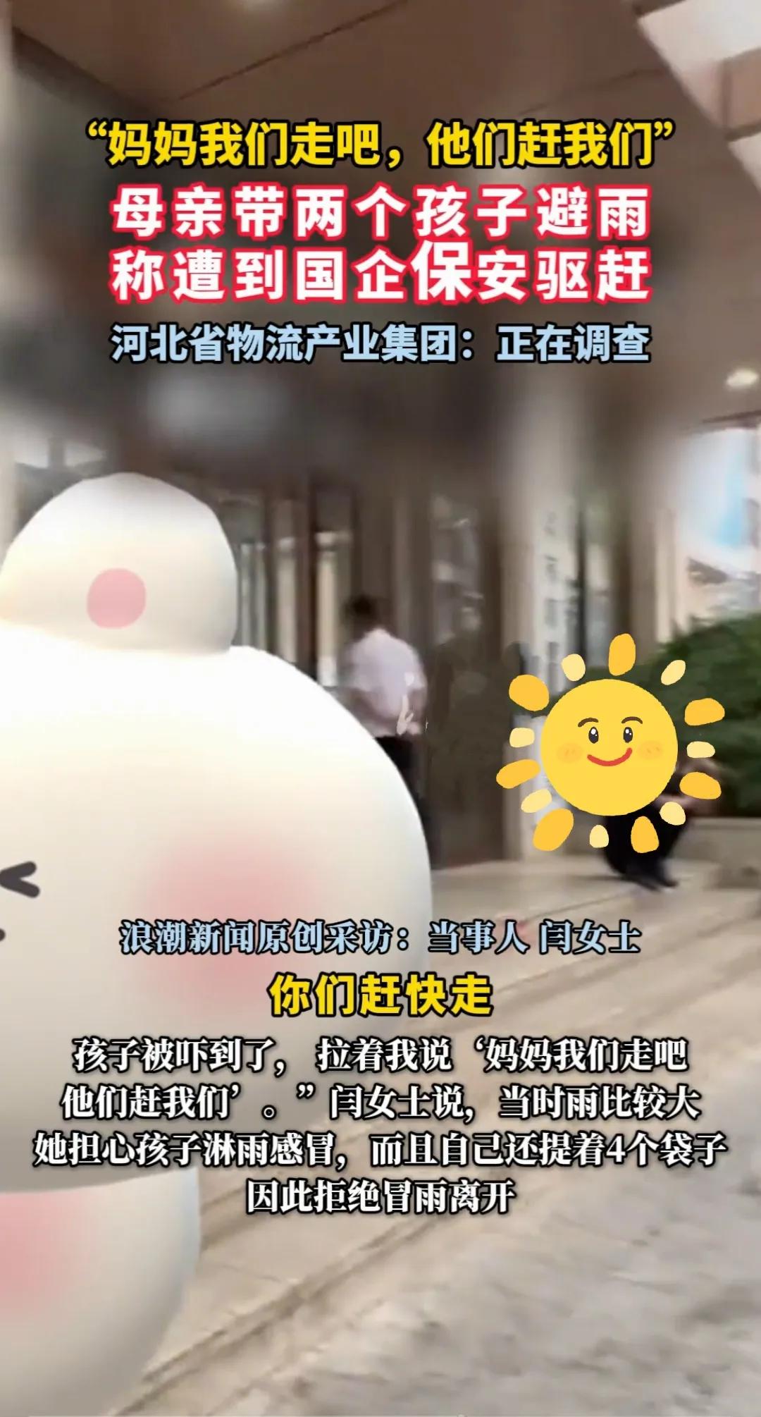 石家庄暴雨,女士和孩子在国企门前避雨,结果遭人不断驱赶 8月12日下午,石家庄的一场倾盆大雨,把一桩关于“屋檐温度”的争议推到了公众眼前。闫女士带着8岁和10岁的孩子,拎着四个沉甸甸的袋子,小心翼翼躲在河北省某物流产业集团有限公司门前的无障碍通道旁。她特意避开出入口,只求让孩子暂时远离风雨,别淋得感冒。可这份小心没能换来体谅,保安和工作人员带着严厉的态度赶来驱赶,两个孩子当场被吓哭,拉着妈妈的手说“我们走吧”,最终三人只能冲进尚未停歇的雨幕中。 这一幕并非孤例。深圳曾有农民工在商场门口躲雨被保安呵斥驱赶,上海某酒店门口,家长带着孩子避雨时被拦在台阶外,北京地铁站台边,环卫工人躲雨遭工作人员白眼……每一次类似事件发生,都会在网络上掀起热议。有人站在保安角度辩解,称他们是在执行单位规定,怕陌生人进入引发安全隐患或担管理责任;更多网友却在追问,难道规定的执行必须以牺牲善意为代价? 涉事国企回应正在内部调查的消息,没能平息公众情绪。人们在意的不仅是这一次的驱赶,更是“公家屋檐”该有的态度。国企由纳税人支撑,建筑冠以“服务社会”之名,门口的屋檐本就不该是冰冷的界限。闫女士和孩子既未堵塞通道,也未破坏设施,短短十几分钟的避雨需求,本可以用更温暖的方式回应。一句“往里站站别挡路”,一把临时借出的雨伞,甚至只是默许的沉默,都能让暴雨中的人心感受到暖意。 孩子们被吓哭的瞬间,记住的或许不只是雨水的冰凉。当“按规定办事”成为冷漠的挡箭牌,当公共空间失去包容的温度,伤害的不仅是当事人的情感,更是公众对“为人民服务”的信任。这场大雨终会停歇,但关于规则与人情的讨论,不该随着雨停而结束。在刚性的制度之外,如何保留一份为人着想的柔软,或许是每个管理者都该思考的“屋檐考题”。石家庄暴雨 国企避雨遭到驱赶 爆料