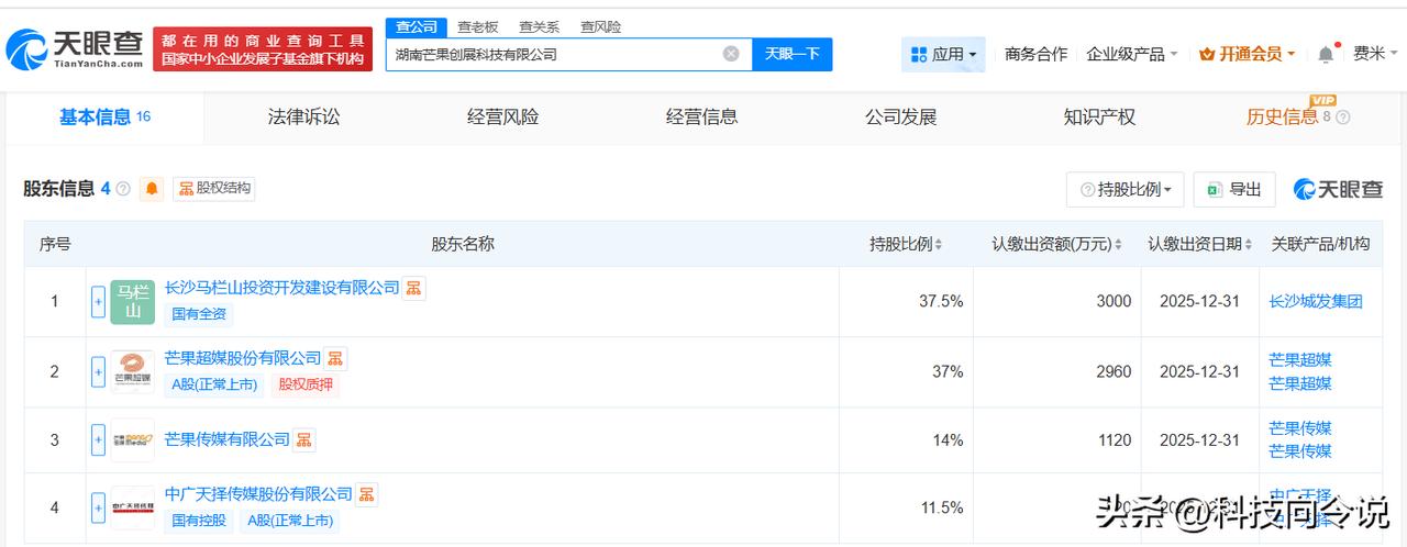 【芒果超媒等成立创展科技公司注册资本8000万】 天眼查App显示,近日,湖南