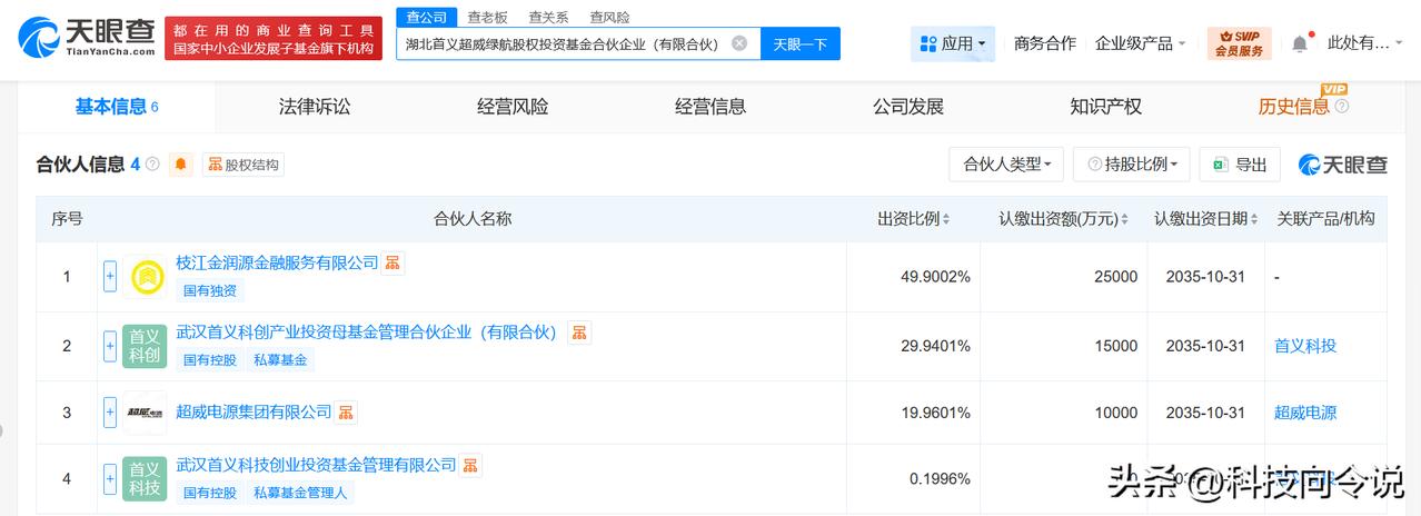 【超威电源等在湖北成立股权投资基金 出资额5.01亿】 天眼查App显示,近日,湖北首义超威绿航股权投资基金合伙企业(有限合伙)成立,执行事务合伙人为武汉首义科技创业投资基金管理有限公司,出资额5.01亿人民币,经营范围含创业投资,以私募基金从事股权投资、投资管理、资产管理等活动。合伙人信息显示,该基金由枝江金润源金融服务有限公司、武汉首义科创产业投资母基金管理合伙企业(有限合伙)、超威电源集团有限公司、武汉首义科技创业投资基金管理有限公司共同出资。 天眼查信息: