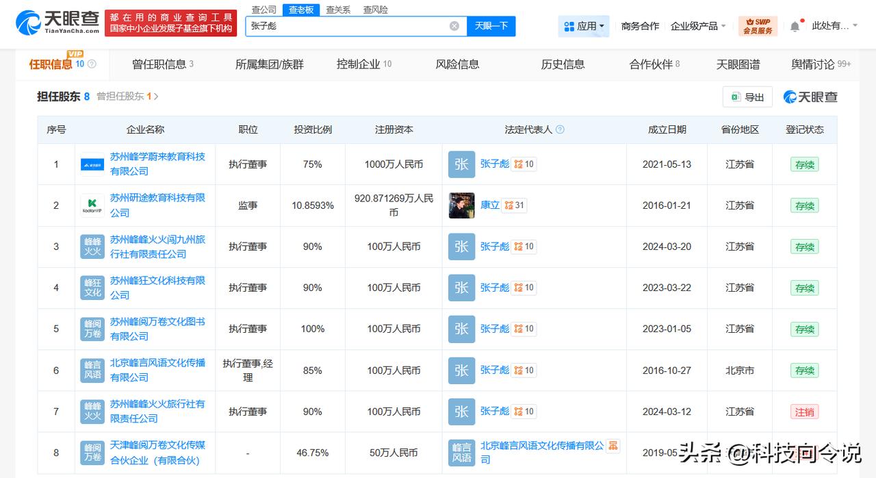 【盘点张雪峰商业投资版图】张雪峰多个平台账号被禁止关注 据媒体报道,考研名师张雪峰的小红书、B站、抖音等多平台账号被禁止关注。 天眼查App显示, 张雪峰(张子彪)名下共关联10家企业,其中8家为存续状态,包括苏州峰学蔚来教育科技有限公司、苏州研途教育科技有限公司、苏州峰火轮科技有限公司、苏州峰峰火火闯九州旅行社有限责任公司、苏州峰狂文化科技有限公司等,版图涉及教育科技、文化传播、旅行社等。张雪峰担任上述公司法定代表人、执行董事、经理等职务,并持有6家公司股份。 天眼查信息:-c2350628379