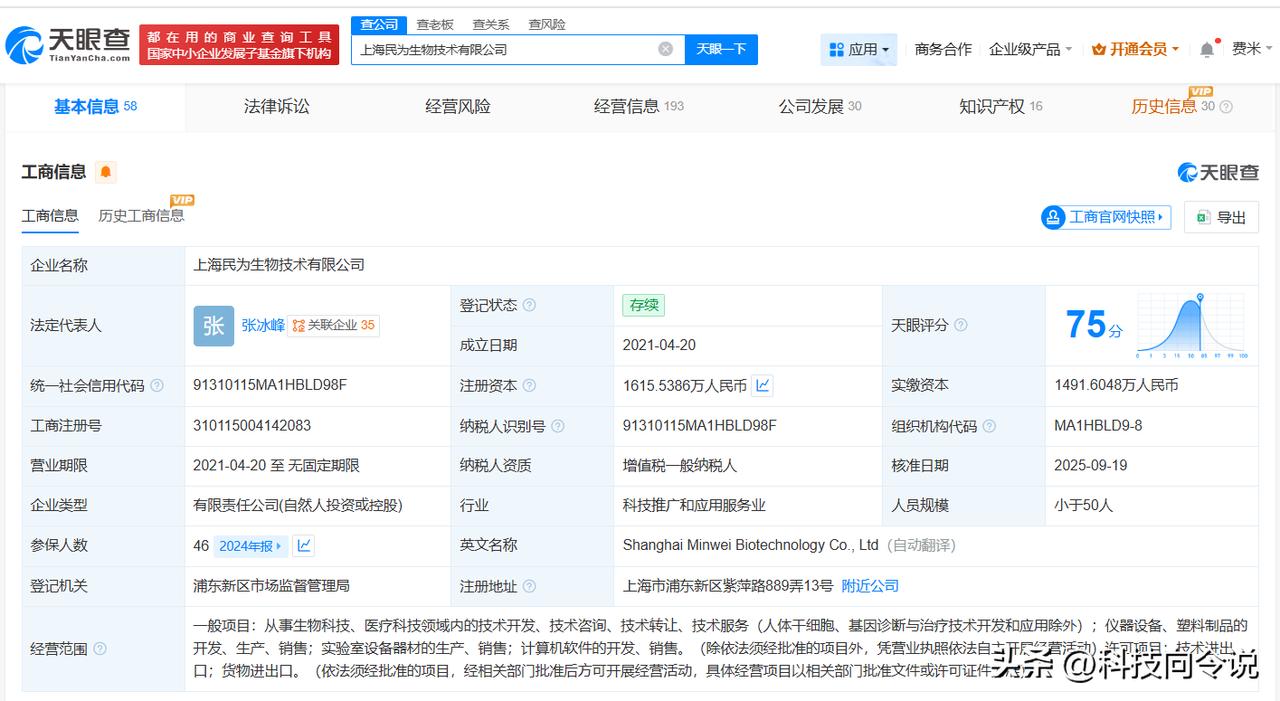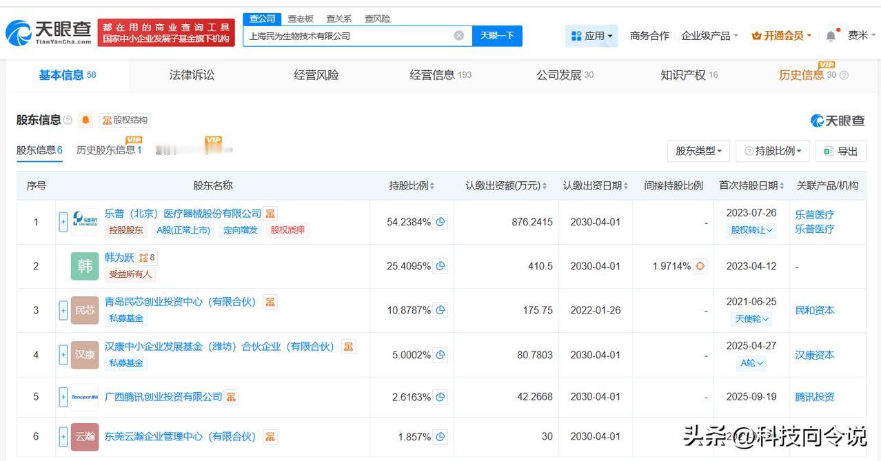 【腾讯入股乐普医疗旗下民为生物技术公司】 天眼查App显示,近日,上海民为生物技