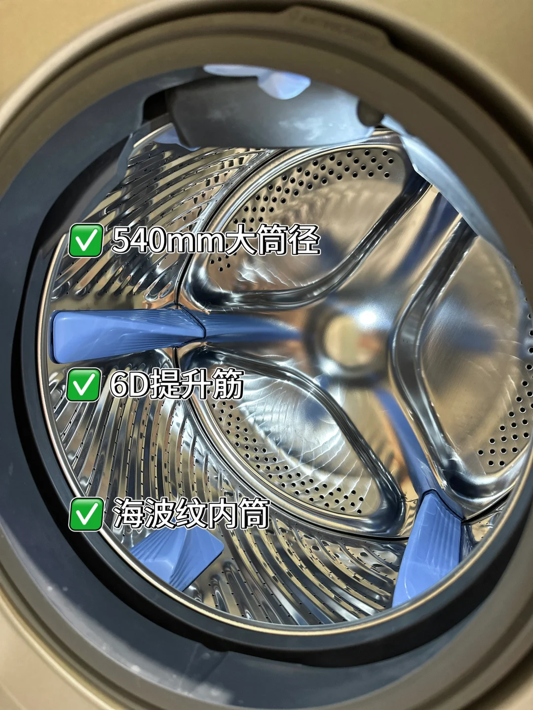 10kg洗+9kg烘的容量,再加上540mm超大筒径(比普通洗衣机大13%),冬天的羽绒服、全家的床单被罩扔进去,完全不打结!内筒还有6根提升筋,能模拟人手搓洗领口、袖口,那些藏在死角的老污渍,轻松被揪出来!