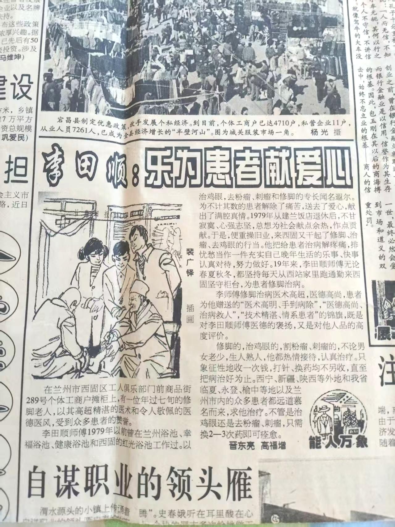 脚上雕花的修脚师李宝明 大西北网讯:记者王志俭(穿石)文图 兰州小西湖中医经络调理康养中心服务热线:18152094078 地址:兰州市七里河区小西湖街道小西湖北街123号(原政府2号楼后侧) 前些日子,记者采访了兰州市小西湖中医经络调理康养中心的、中医按摩调理师马其荣老师,后文章在头条、新浪微博等著名网站刊发后,吸引了省内外众多读者的关注。 回访意外遇到祖传修脚师 昨天记者再次来到小西湖甘肃省肿瘤医院、斜对面的小西湖中医经络调理康养中心,想回访调理师马其荣老师。可他的工作室有几位等候按摩的人,马老师正忙得不可开交。就在我感到有些遗憾时,发现院中沙发上坐了几个人正在泡脚。“王记者,你来的正好,这儿来了一位祖传修脚师傅。修完脚后特舒服,等会你体验一下就知道了。”常来这里的一位男顾客对记者说到。 “你把脚拿上来。”穿着白工作服的修脚师对男顾客说到。男顾客将脚放到一个长条形小桌上。只见修脚师戴上塑料手套,双手抓着脚来回转了几下,那眼光就像欣赏一件艺术品。然后拿起一把稍宽小刀从上到下认真刮起。小刀在修脚师手腕灵活的操作下,一片片糙皮像雪花一样落下。稍后修脚师又用小刀细心修理指甲,而后又用双手揉搓按摩脚面脚心,彼时男顾客发出舒服的哼哼声。 修理完男顾客的脚后,修脚师又给一位女顾客开始修脚。“你不仅修了脚还给脚美容了!”女顾客看了修完脚的“芳容”,不由喜上眉梢发自内心的赞叹道。之后,修脚师又给记者开始修脚。我是灰指甲几个脚指甲很厚“模样”不雅,经修脚师一番精心打理后,脚面变得光滑指甲恢复正常。原来自己都不愿意多看几眼的双脚,彼时却让我看了又看。 我家三代都是修脚师 修脚师理得光头,配上白衣蓝裤显得十分利落。虽年已六旬但外表年轻精神。他有些腼腆说,我家修脚是祖传,到我这代已是第三代修脚了。爷爷当年在河南开过澡堂,修脚是他的拿手绝活。父亲李田顺是北京清华池澡堂的修脚师傅,50年代中期被借调到兰州浴池工作,后来就留在兰州直到退休。父亲当时在兰州服务公司(浴池归其管理)名气很大,记得父亲当年给领导和名人都修过脚。1995年5月26日甘肃工商报,还专门配图报道了父亲的事迹。 父亲那时常说修脚是个技术活,人要走路就离不开它,虽不能挣大钱但养家糊口没有问题。父亲的话对我很有启发,而我自己对修脚也颇感兴趣。七十年代末父亲退休前,我跟着他的师弟开始学艺。修脚靠的是一把刀,磨刀是最基本的要求。 我学艺先从磨刀开始,然后从翩刀(削老茧),锵刀(修长指甲)、调刀(修小指甲)开始练习。基本功则要从竹板、筷子上反复练手,直到两年后师傅才让我接单。记得第一位顾客是个40多岁的中年男子,修完脚后男子很满意可我出了一身汗。有年离高考只有10多天时间了,店里来了一位参加高考的学生,他指甲钻进肉里行走困难,去了几家医院都说要开刀。 后别人介绍来到我的店里,我用几十分钟就取出钻进他肉里的指甲,整个过程没有一点痛感,小青年取完指甲后走路自如面露喜色。小青年后来顺利考上了大学,他们一家人专门来到店里向我报喜并一再表示感谢。我的一次普通修脚经历,却改变了一个小青年的命运,这件事让我很有成就感,直到今天都感到很自豪。 我那时还在单位上班,改革开放自由市场开放,晚上我就去夜市摆摊挣外快。摆摊让我生活得到一定提高,同时也让我看到了自己的价值。90年代我专门去西安参加修脚考试,拿到了权威部门颁发的修脚师证书。退休后我开过修脚屋,还被多家修脚屋聘为技师。几十年来我治愈的脚病患者不计其数,也培养了10多个徒弟。有的在新疆有的在湖北和其他省份,他们都利用我教授的修脚手艺,自食其力过着各自的安稳日子。 这是让我这个普通人感到最欣慰的事情,如今我年已六旬但身体尚好愿意再为人们服务,我也没啥其他爱好,修脚让我感到生活充实,同时也给我带来了乐趣与自信。所以我想继续从事修脚事业,一直干到干不动那天为止! 我的服务方式灵活,顾客可来兰州小西湖中医经络调理康养中心,也可以拨打手机13639369201,预约我上门为您服务。