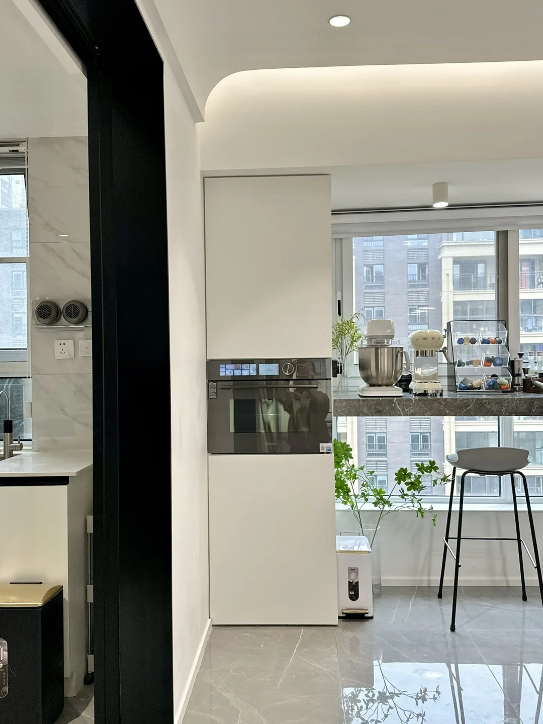 我家选择的是把它装到了高柜里,左侧是储物柜和嵌入式蒸烤一体机,北面的飘窗改成吧台组合柜,右侧是零食柜,中间是悬浮吧台,嵌入高柜这样不仅美观,平时在这边烘焙🍪、蒸烤食物🦐🍖也很方便,用着不弯腰,热气不扑面,烹饪时也不担心烫腿。