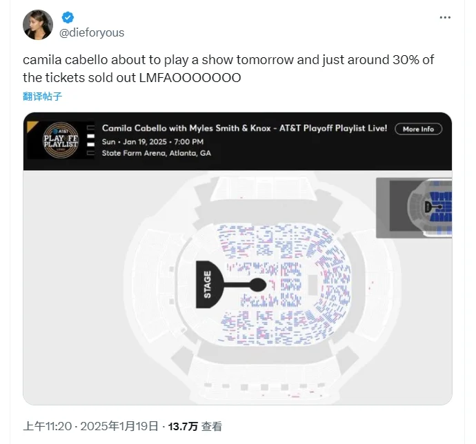 Camila Cabello 最近在亚特兰大开演唱会,演唱会是以卡妹领衔的拼盘演唱会,门票只卖出3成。