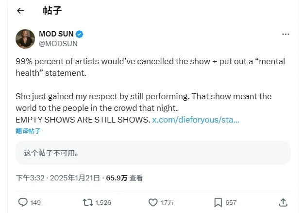 “99%的艺人遇到这样的情况都会以有心理健康问题为由取消演出。但她仍然坚持演出,这赢得了我的尊重。那场演出对当晚观众来说意义非凡。没有观众的演出依然是演出。”