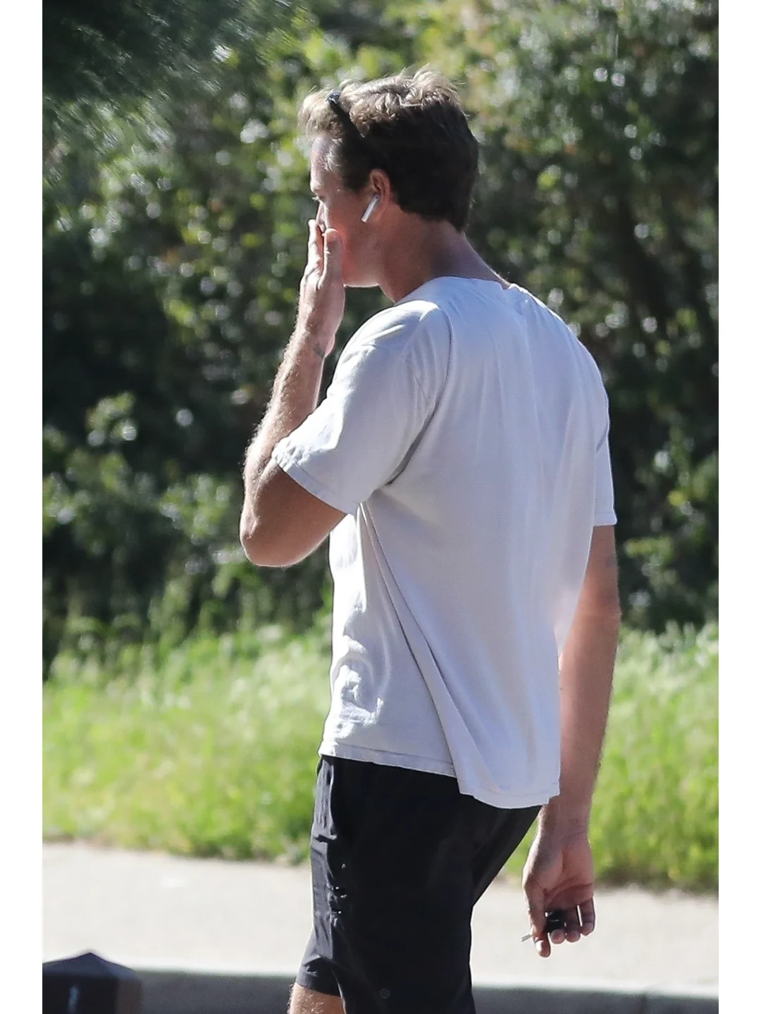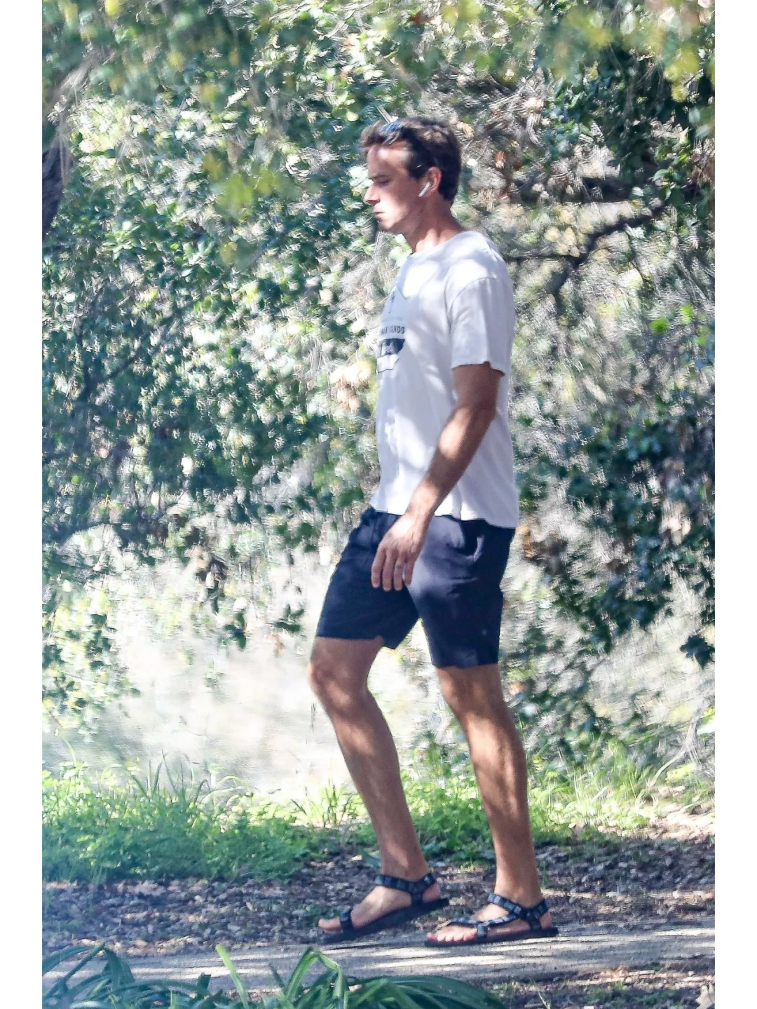 艾米·汉莫穿着一条短裤和一件T恤,脚上穿着凉鞋,耳朵上戴着一副耳机。行走时,他看起来若有所思,似乎正在磨牙吮血,寻觅捕食目标。