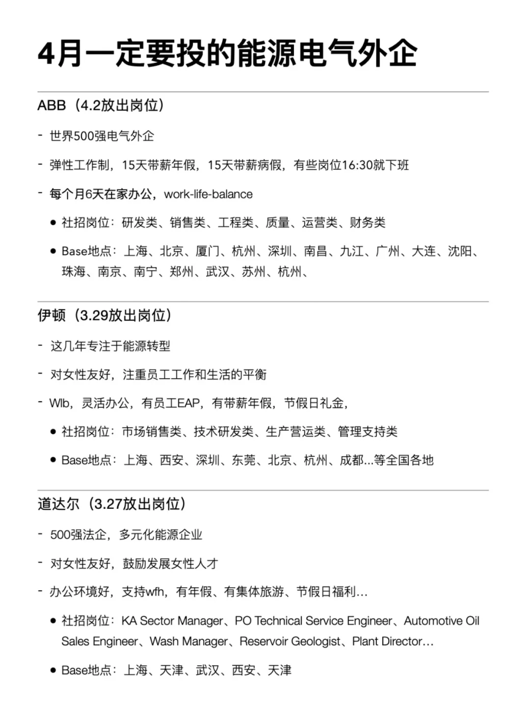 能源电气外企相对来说业务都很稳定,福利也很好,正好3月底4月初有非常多开了岗位了,就来整理了一波