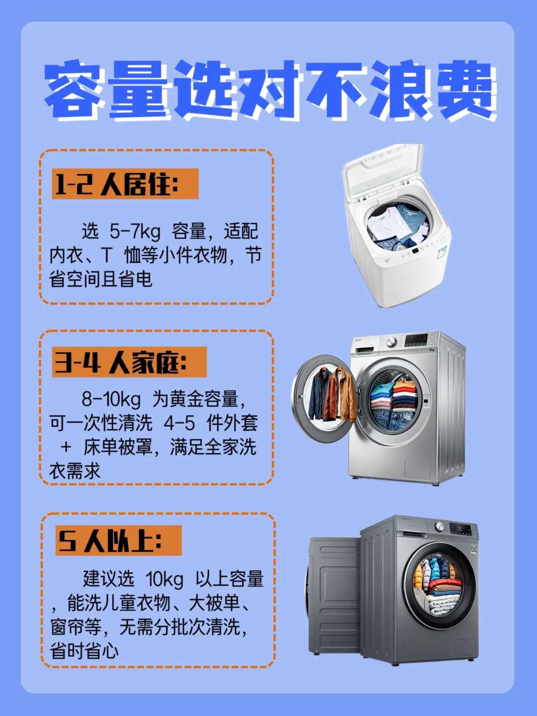 ▪️1-2 人住:选 5-7kg,洗内衣、T 恤、小件衣物刚好,不占地方还省电;