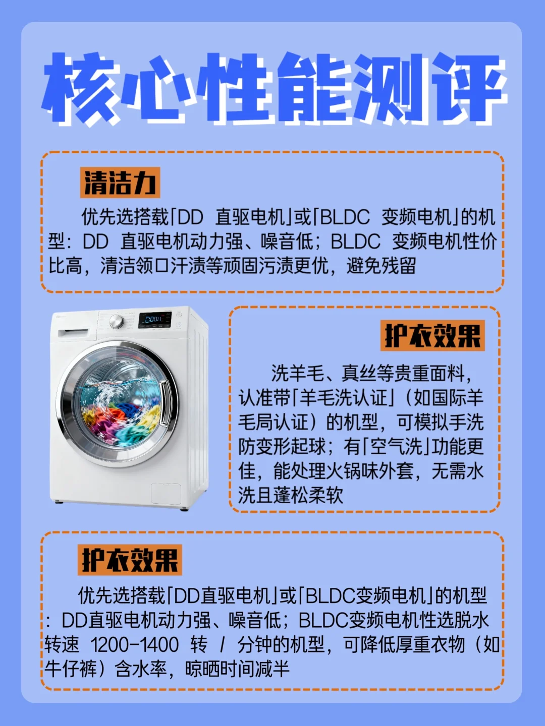 ▪️清洁力:首选带「DD 直驱电机」或「BLDC 变频电机」的!前者动力足还静音,后者性价比高,洗顽固污渍(比如领口的汗渍)更给力,避免洗了像没洗的尴尬~