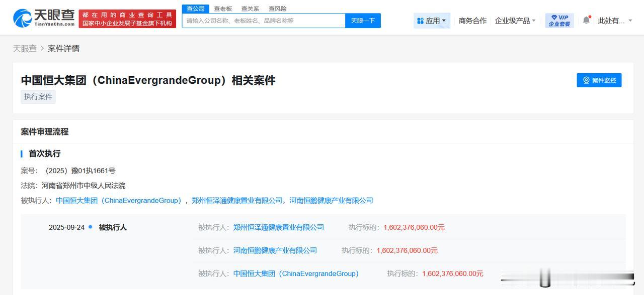 【中国恒大集团等被执行16亿】 天眼查App显示,近日,中国恒大集团、郑州恒泽通健康置业有限公司、河南恒鹏健康产业有限公司新增一则被执行人信息,执行标的16亿余元,执行法院为河南省郑州市中级人民法院。 天眼风险信息显示,中国恒大集团现存12条被执行人信息,被执行总金额超86亿元,此外,该公司还存在失信被执行人(老赖)及终本案件信息。 天眼查信息: