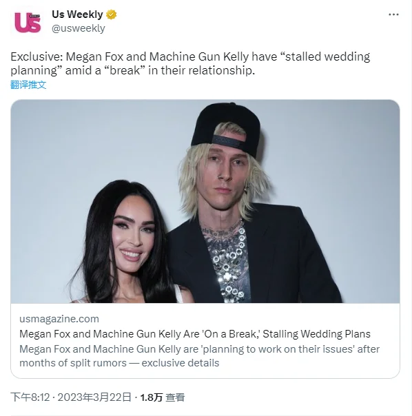 根据Us Weekly的报道,梅根福克斯 Megan Fox 与“枪哥”Machine Gun Kelly 暂时分手(On a Break),并且他们把婚礼也延期了。