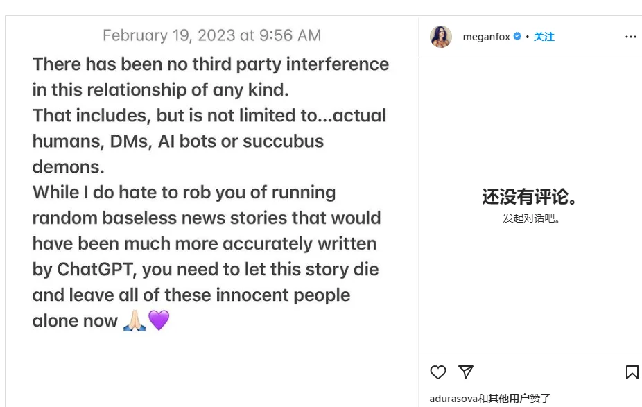 之前Megan删光了她和枪哥的合照,引用Beyoncé骂丈夫的出轨情歌“Pray You Catch Me”发帖,然后清空了账号。虽然此前Megan的一切暗示都指向枪哥出轨了,但现在Megan本人已经澄清没有第三者。