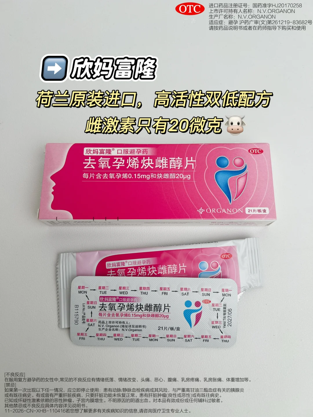 如果对激素量比较介意,可以看看荷兰原装进口的欣妈富隆,它用的是低雌配方,每一粒的雌激素是20微克,避孕效果不下降的情况下,还会降低身体适应的门槛,更加温和,副作用更小。