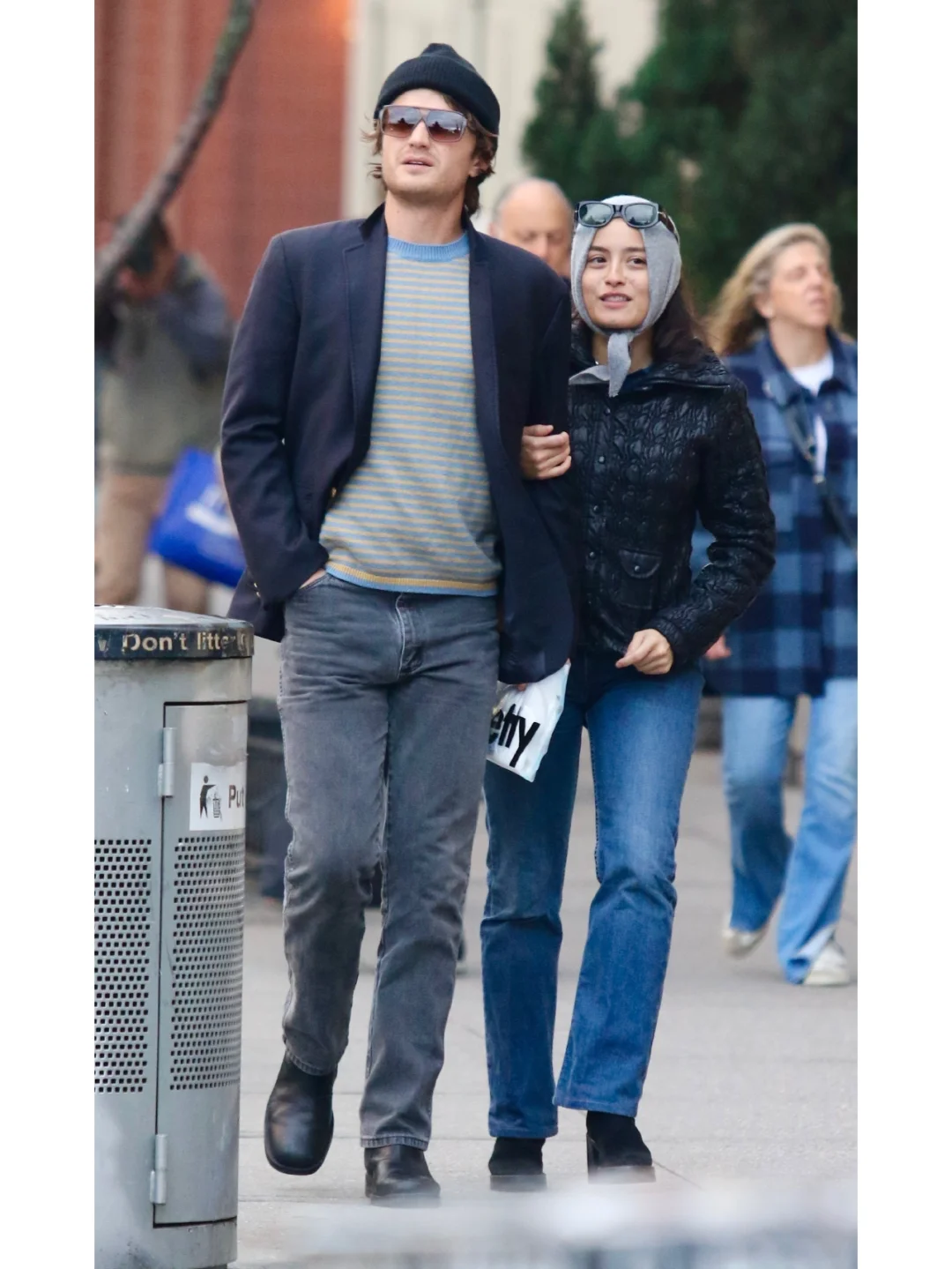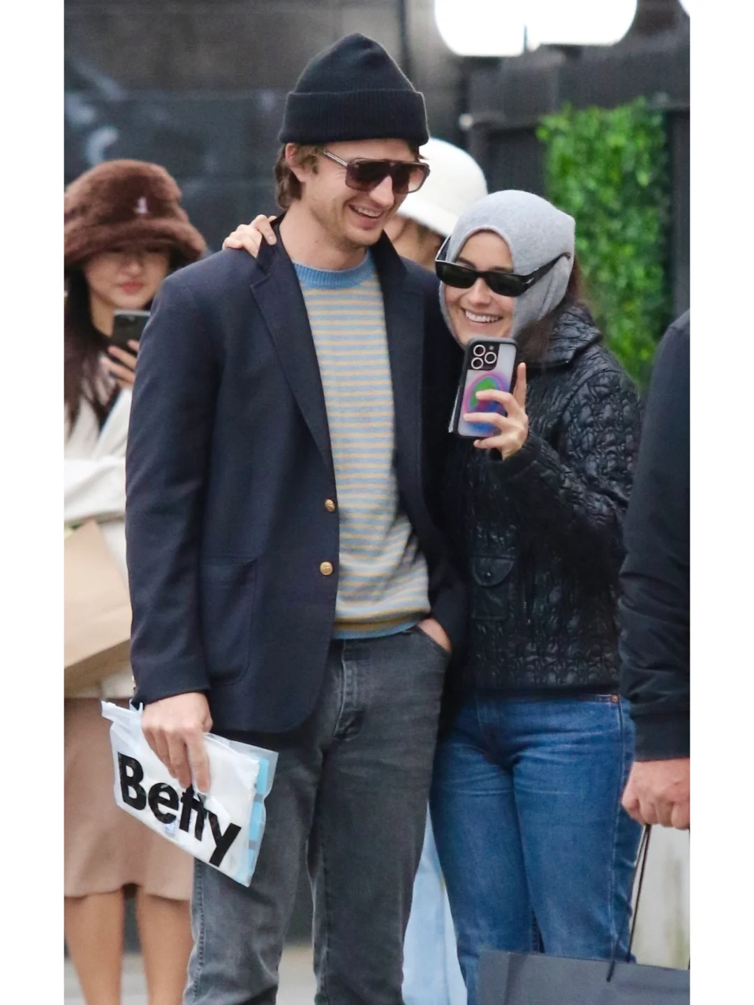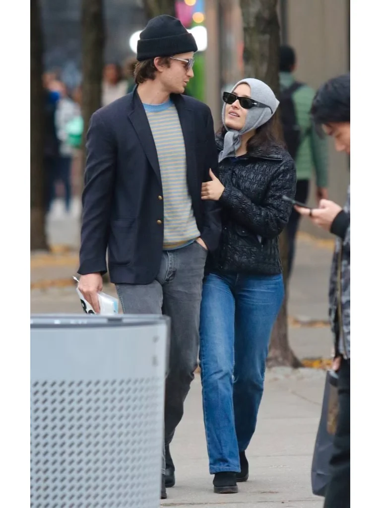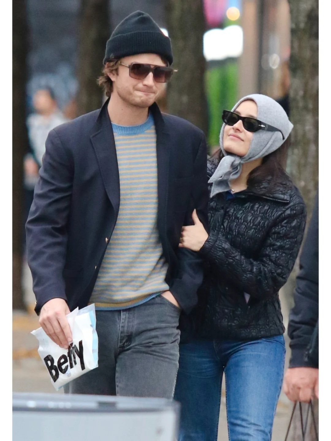 Chase Sui Wonders紧紧搂着 Joe Keery 的手臂,用另一只手环绕着他的后背,像一个爱撒娇的小女孩。散步期间,Chase给Joe看了一眼她手机里刷到的好玩内容,引得两人哈哈大笑。