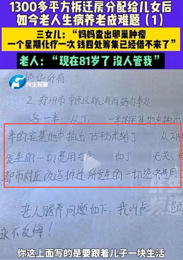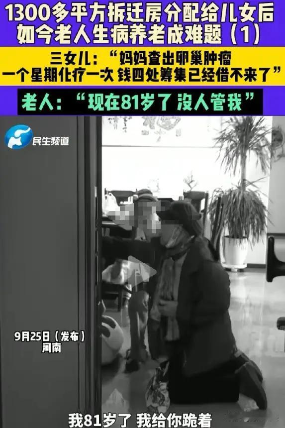 河南郑州,卢老太十几年前拆迁时,把1300多平的房子尽数给了儿子,还约定一同生活。可儿子拿到房子后,却对她不闻不问。卢老太患病后被查出卵巢肿瘤,每月要化疗三四次。小女儿四处借钱为她治病,儿子却分文不出,就连法院调解后每月600元的赡养费都不给。 卢老太找儿媳索要,儿媳哭穷,还让她跟两个女儿轮流照顾,卢老太坚决不从。 郑州的卢老太,本是个平凡的农村妇女。十几年前,为了让家人有更好的未来,她毅然把辛苦打拼一辈子换来的1300多平房子都给了儿子。那时的她,满心憧憬着一家人能和和美美、相伴一生。然而,现实却如同一盆冷水,将她的美好期许彻底浇灭。 房子到手后,卢老太满心盼着儿子能关心照顾她,等来的却是冷漠与无视。儿子日渐疏离,在她生病时,更是形同陌路。她身体每况愈下,查出卵巢肿瘤,每月要进行三四次化疗,病痛不仅折磨着她的身体,更煎熬着她的心。 令人痛心的是,卢老太的两个女儿心疼母亲的病情,四处借钱为她筹集治疗费,毫无怨言,只盼母亲能熬过难关。可儿子呢?对母亲的病情漠不关心,连法院调解后的每月600元赡养费都分文未付。 卢老太多次尝试与儿子沟通,要求他尽赡养义务,得到的却只有冷漠回应。她去找儿媳寻求理解与帮助,儿媳却哭穷,还让她和两个女儿轮流照顾,仿佛母亲的病痛只是一件微不足道的家务事。面对这般态度,卢老太心如刀割,自己付出了一切,换来的却是这般冷漠。 在社会飞速发展的当下,多少像卢老太这样的老人,被家庭变故和子女冷漠所伤。我们在追逐物质繁荣时,常常忽略了对父母的孝心与关爱。孝道,绝非空谈,而是需用行动践行的责任。 这不仅是一个家庭的悲剧,更是社会的警钟。我们能否在快节奏的生活中,停下脚步想一想:父母的艰辛付出,子女的应尽责任?我们是否还记得,那个为家庭倾其所有的老人?他们的笑容,是否值得我们用一份关爱去温暖? 每个人都可能成为像卢老太一样的老人,或许明天我们就会站在他们的位置。善待父母,是我们每个人的责任,也是对自己最好的投资。让我们用行动告诉那些为家庭默默奉献的人:你们的付出,我们从未忘记。我们愿成为让他们晚年不再孤单的人。 因为,孝心不应只是一时冲动,而应是一生的坚守。郑州旧房