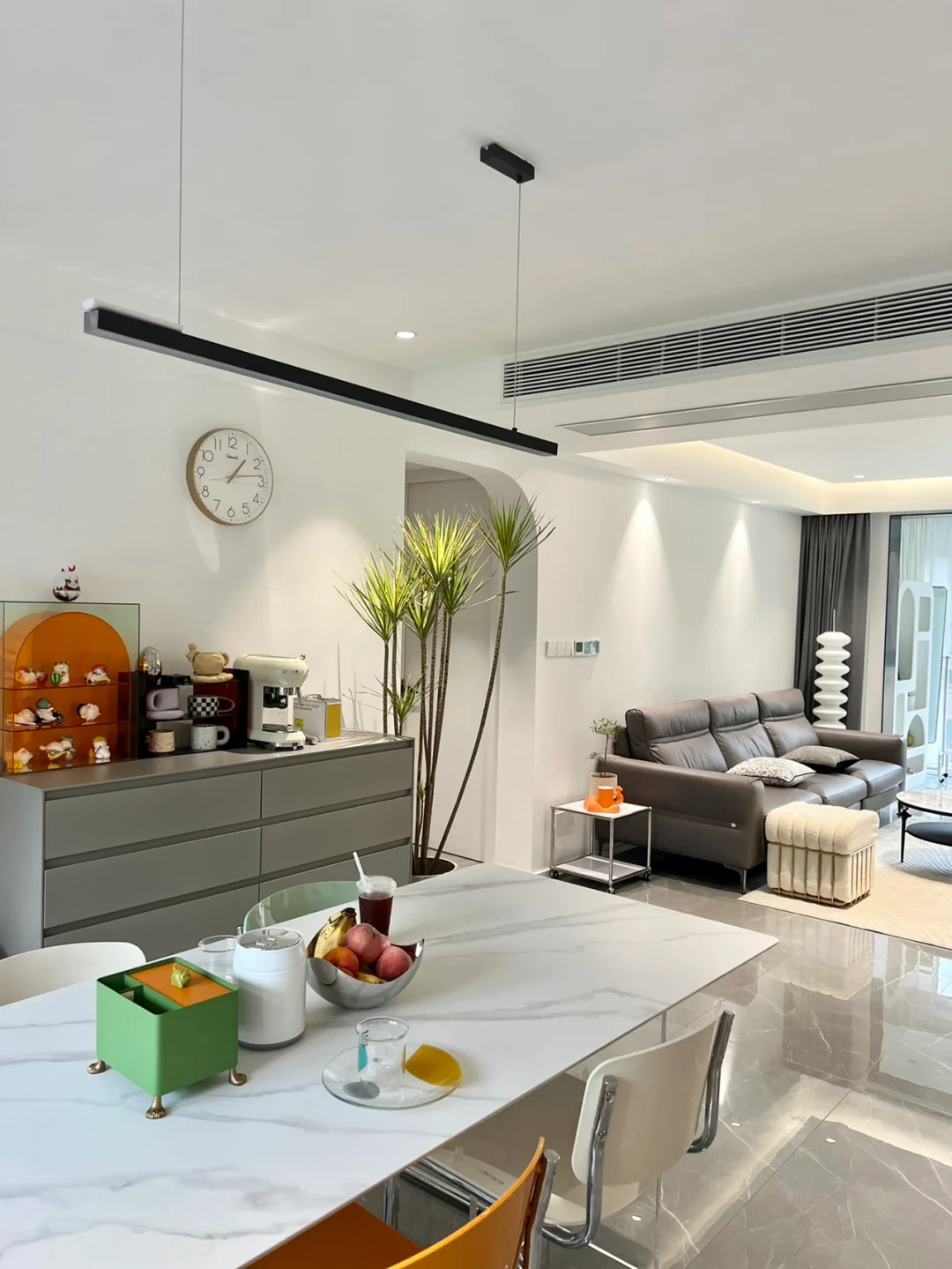 🌟客厅、餐厅、厨房、阳台都是用的1200*600大规格浅灰色亮面砖通铺,无过门石、无波导线,用蕞接近的颜色美缝,几乎看不到缝隙,地面整个连贯,视觉上更显大;