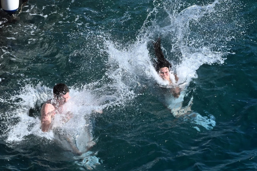 当日Dua Lipa着住一身黑白波点比坚尼上阵,大晒fit爆身形;而Callum Turner就身穿一条鲜橙色泳裤,发动「短裤诱惑」,两人全程密密黐,玩到湿晒身!