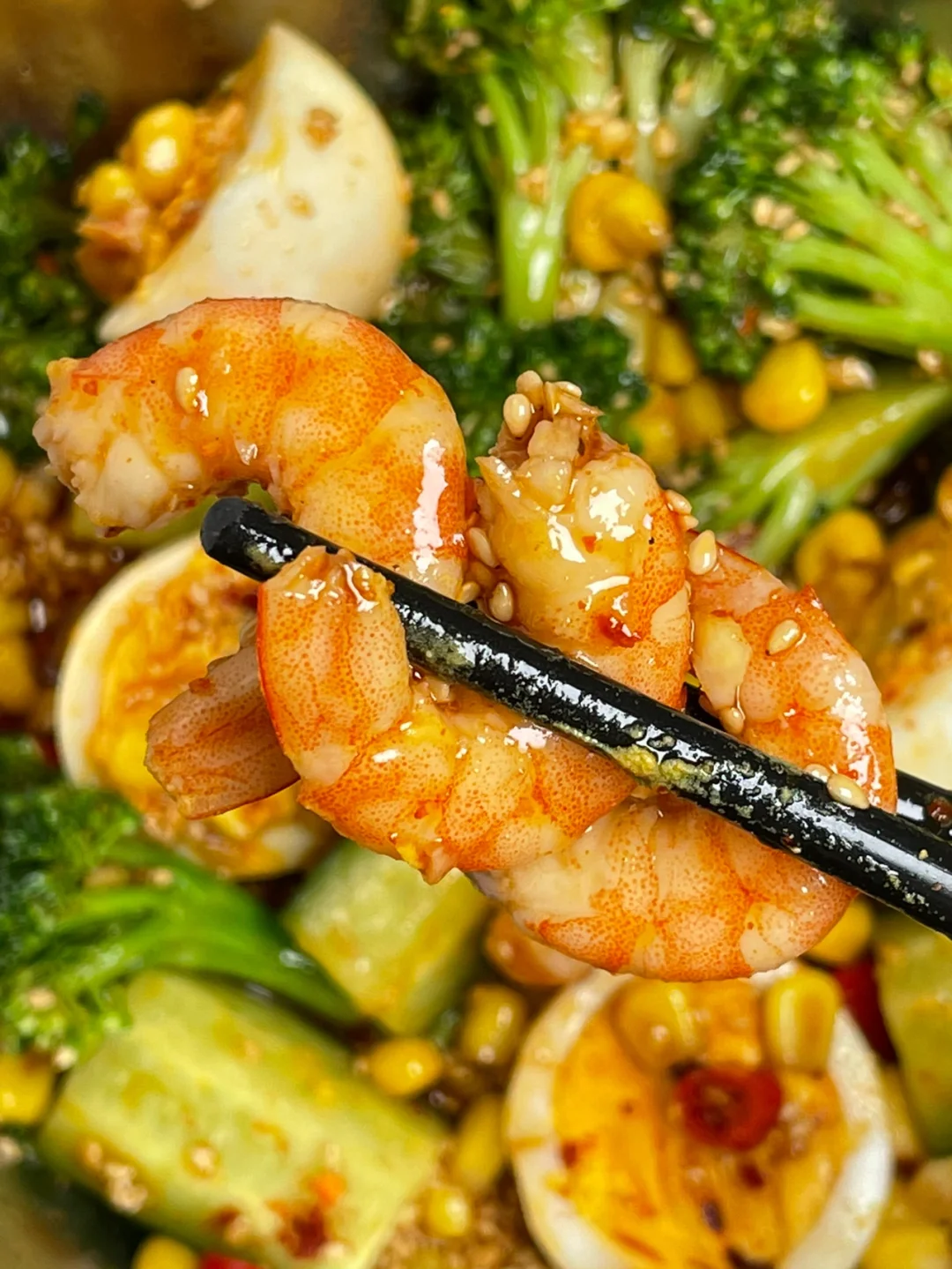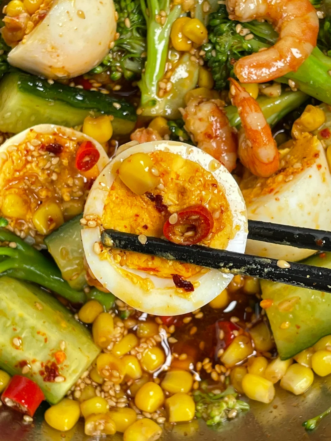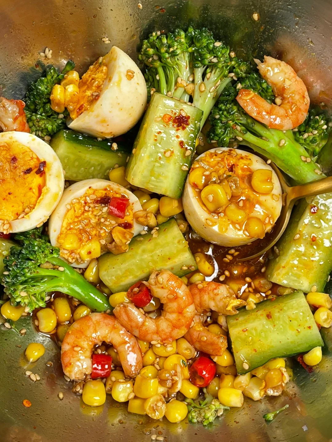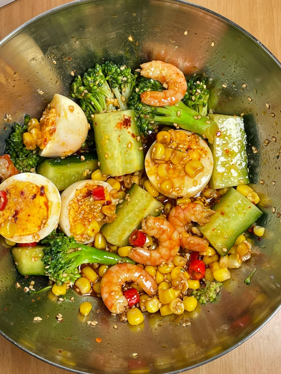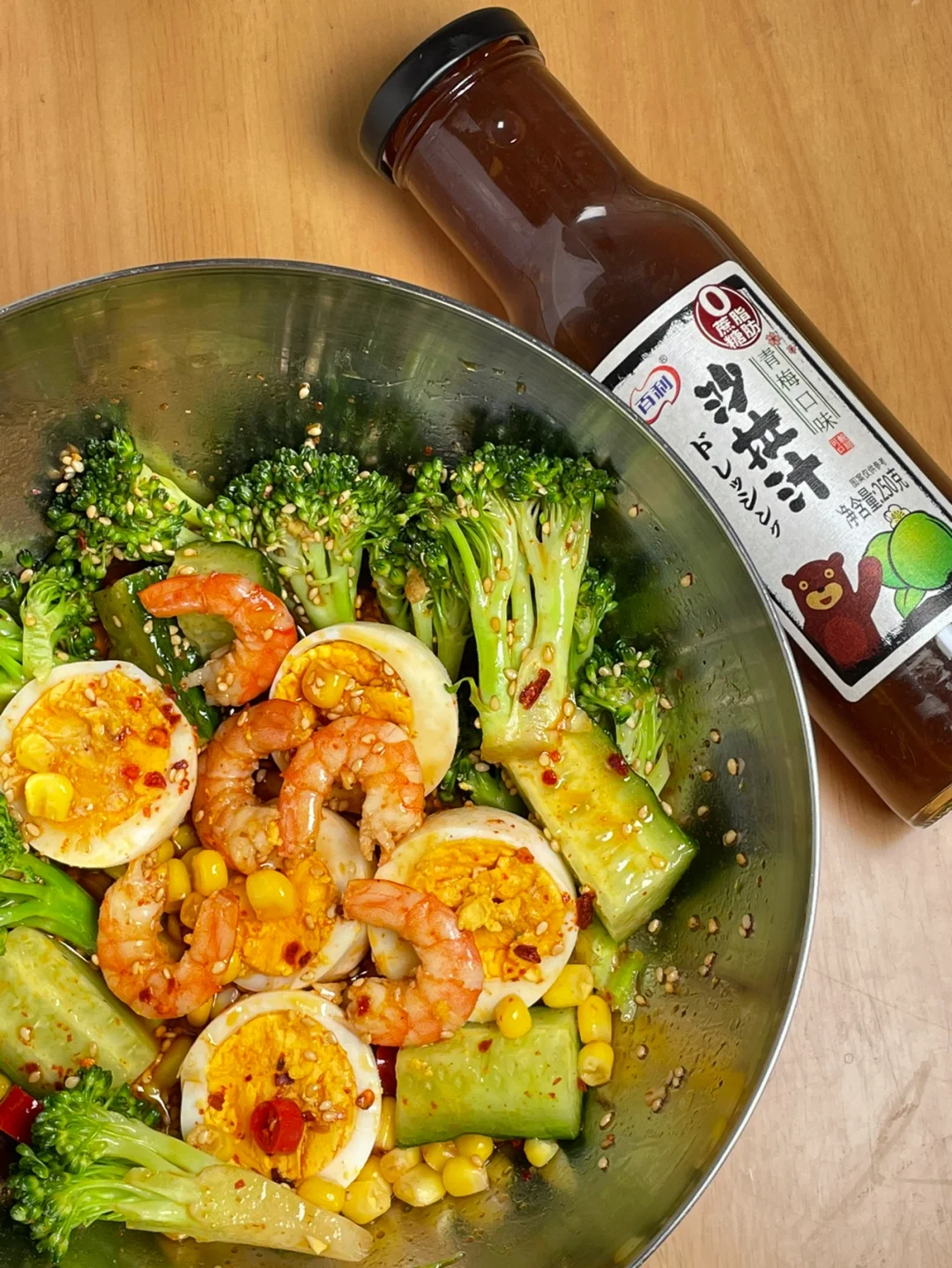 🌟鸡蛋煮熟、玉米剥开焯水、黄瓜拍一下切段、虾煮熟。再倒入料汁,搅一搅拌一拌!青梅味的百利油醋沙拉汁酸酸甜甜,0脂肪0蔗糖,吃起来没负担,好吃不胖!