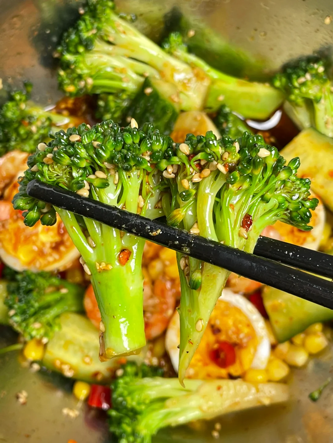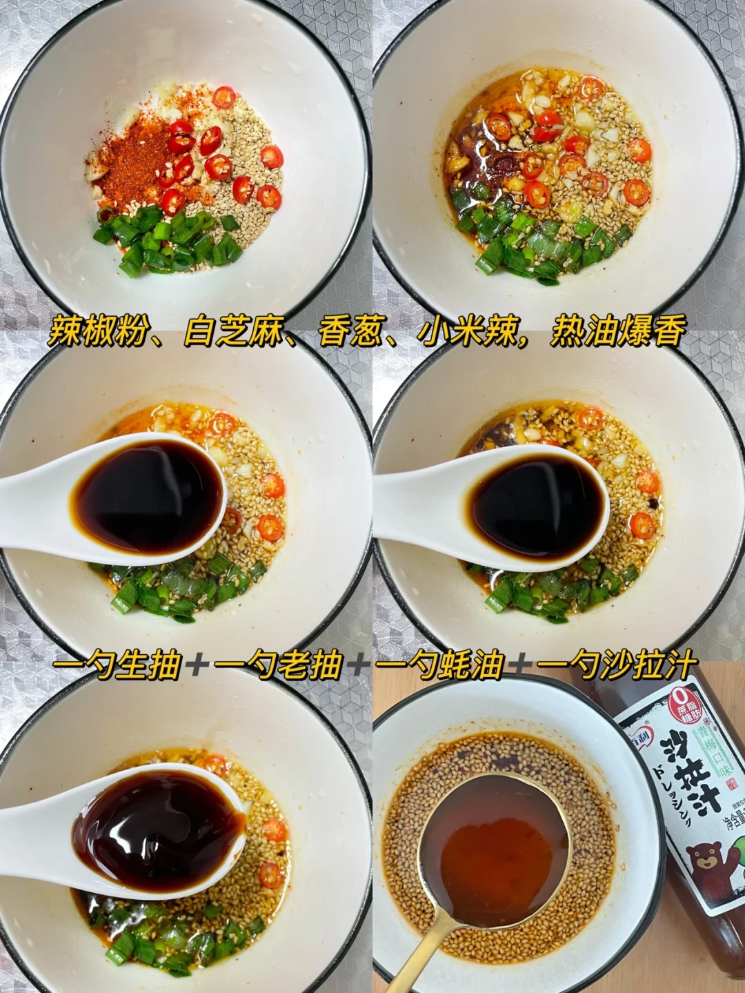小米辣➕蒜末➕白芝麻➕辣椒面,热油爆香。再加入一勺生抽➕一勺蚝油➕一勺青梅沙拉汁。